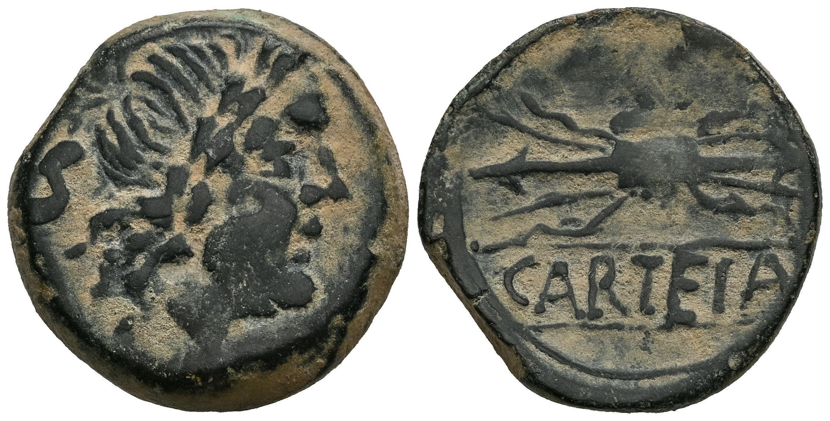 Carteia. Half unit. 80-20 BC. San Roque (Cadiz). (Abh-652). (MIB-200/01a). (Acip-2544). Anv.: Head of Jupiter right, S behind. Rev.: Sheaf of rays, S above, CARTEIA below. Ae. 10,14 g. Very rare. VF/Almost VF. Est...100,00.