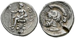 Cilicia. Tarsos. Stater. 380-373 BC. Pharnabazos. (SNG BnF-256). (Casabonne-Series 4). Anv.: Baaltars seated to left, holding lotus tipped sceptre; B'LTRZ in Aramaic to right, astragalos beneath throne. Rev.: Bearded male head (Ares?) to left, wearing crested Attic helmet; FRNBZW in Aramaic to left, HLK in Aramaic to right. Ag. 10,66 g. Test cut. Ex Classical Numismatic Group 403 (09/08/2017), lot 221. Choice VF/VF. Est...250,00.