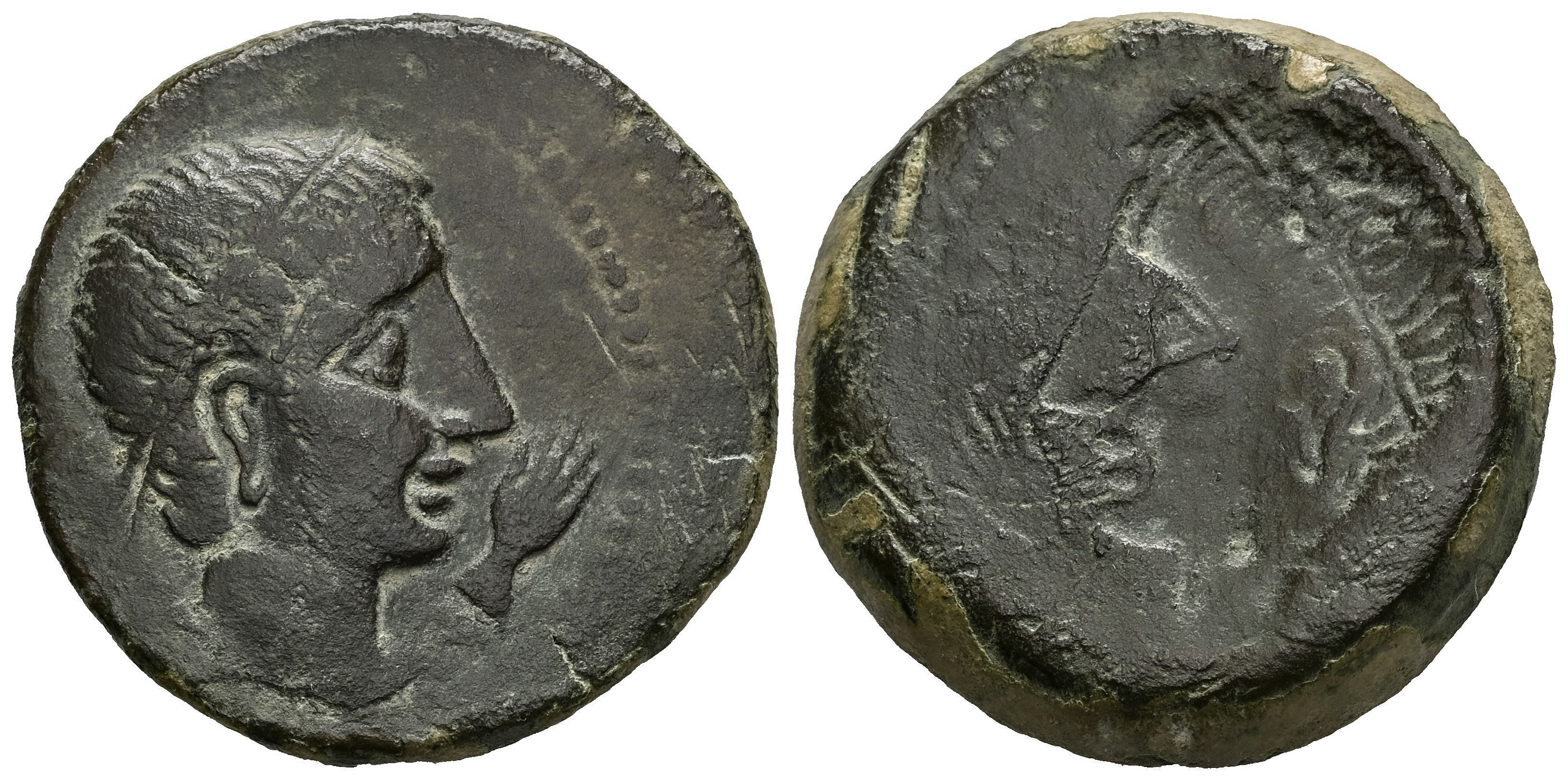 Kastilo-Castulo. Brockage unit. 180 BC. Cazlona (Jaén). (Abh-700). (Acip-157/39b). (Acip-2143). Anv.: Diademed male head right, hand before. Rev.: Incuse of obverse. Ae. 16,73 g. Rare. VF. Est...120,00.