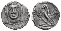 Cilicia. Obol. 4th century BC. Uncertain mint. (SNG BnF-472). (Sng Levante-229). (Sng von Aulock-5424). Anv.: Facing head of Herakles, wearing lion skin headdress; all within circular beaded border. Rev.: Eagle standing to left on stag's head; all within rectangular beaded border. Ag. 0,76 g. A good sample for this type. Almost XF. Est...120,00.
