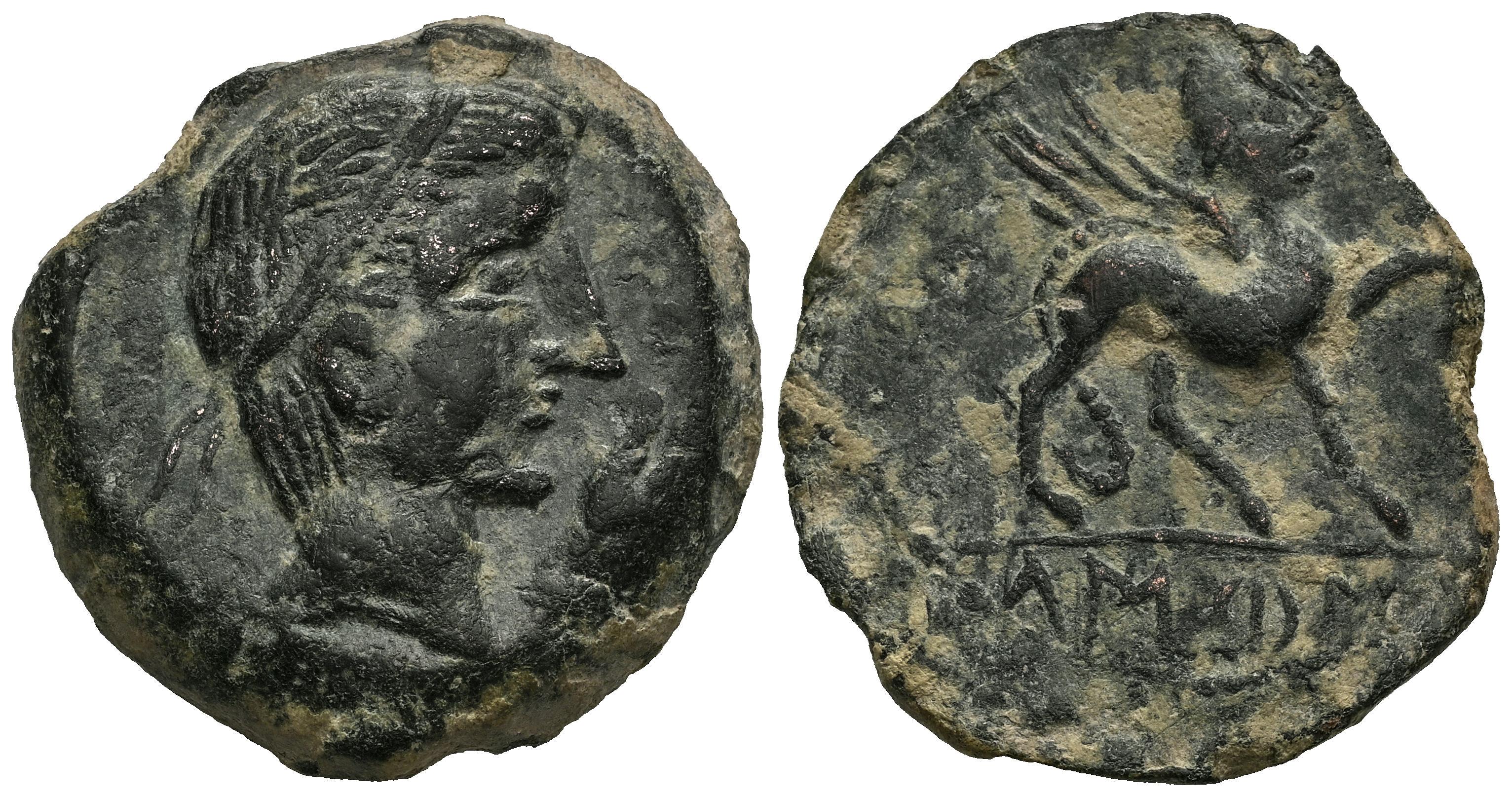 Kastilo-Castulo. Unit. 180 BC. Cazlona (Jaén). (Abh-700 var.). Anv.: Diademed male head right, hand before. Rev.: Sphinx right, legend KASTILO right, in exergue. Ae. 14,62 g. Unusual hairstyle. Rare. Choice VF/Almost VF. Est...80,00.