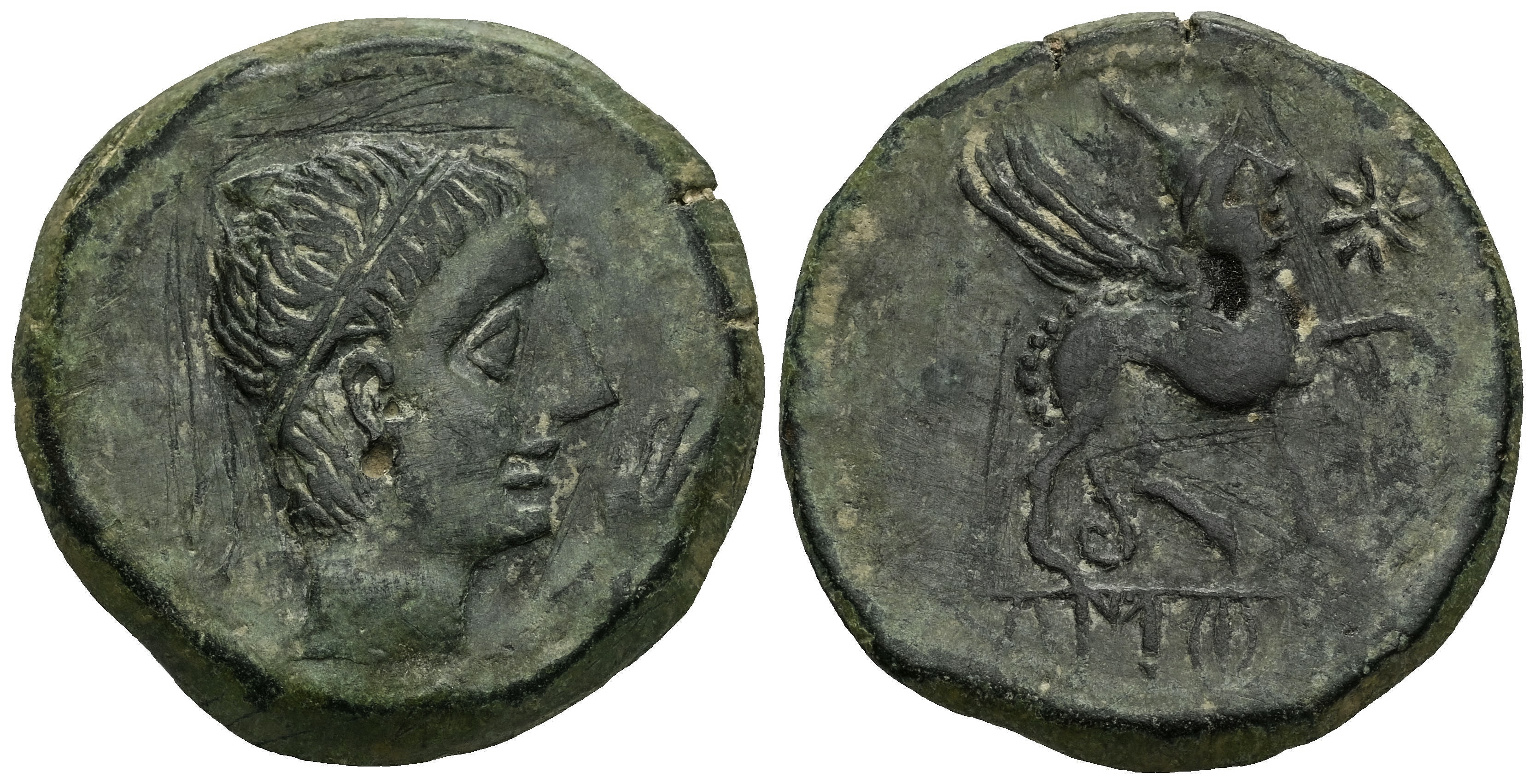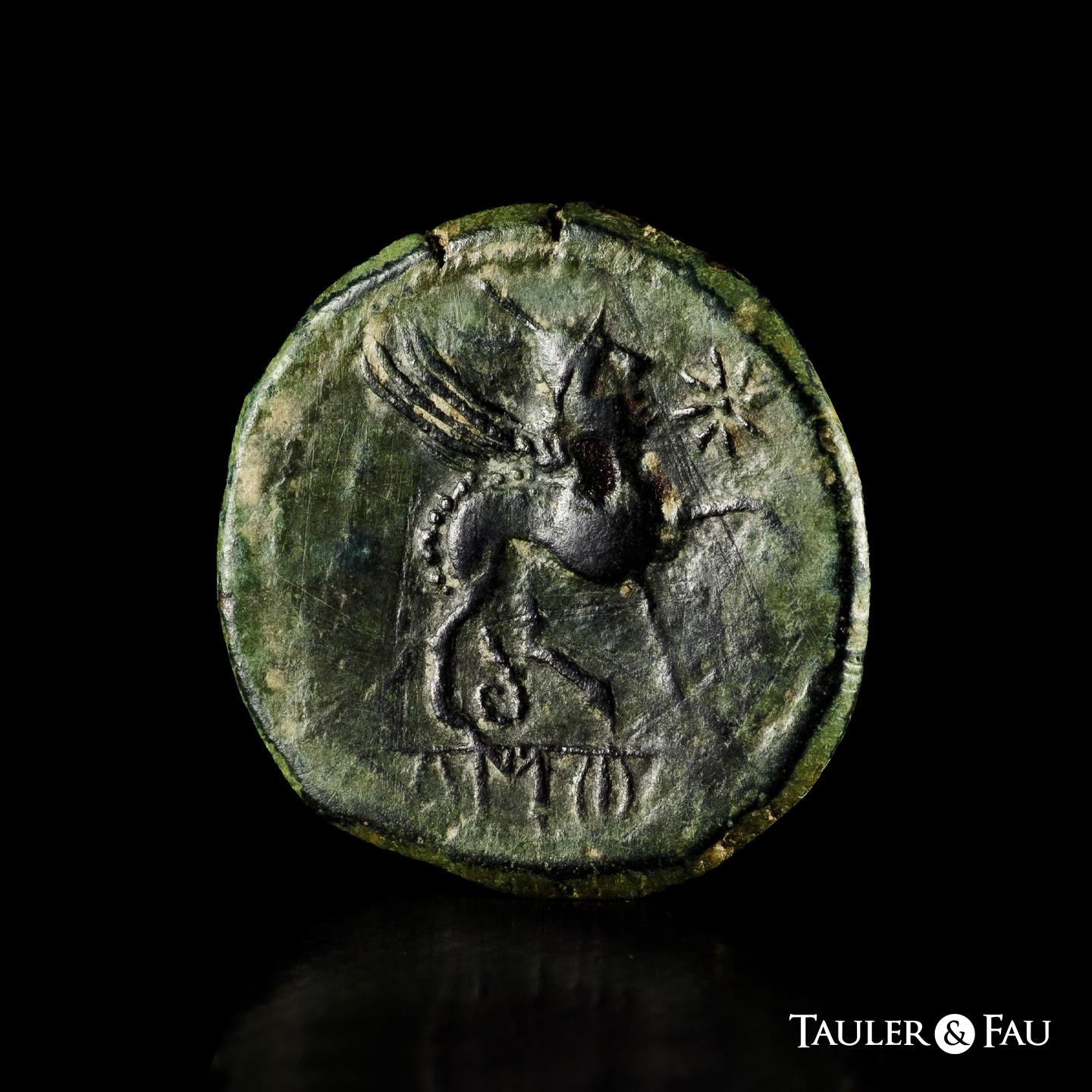 Kastilo-Castulo. Unit. 180 BC. Cazlona (Jaén). (Abh-701). (MIB-157/39a). (Acip-2142). Anv.: Diademed male head right, hand before. Rev.: Sphinx right, with star, legend KASTILO right, in exergue. Ae. 15,34 g. Cleaning hairlines. VF. Est...60,00.