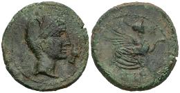 Kastilo-Castulo. Unit. 180 BC. Cazlona (Jaén). (Abh-701). (MIB-157/39b). (Acip-2143). Anv.: Diademed male head right, hand before. Rev.: Sphinx right, with star, legend KASTILO right, in exergue. Ae. 12,92 g. Struck over As of Obulco. Almost VF. Est...80,00.