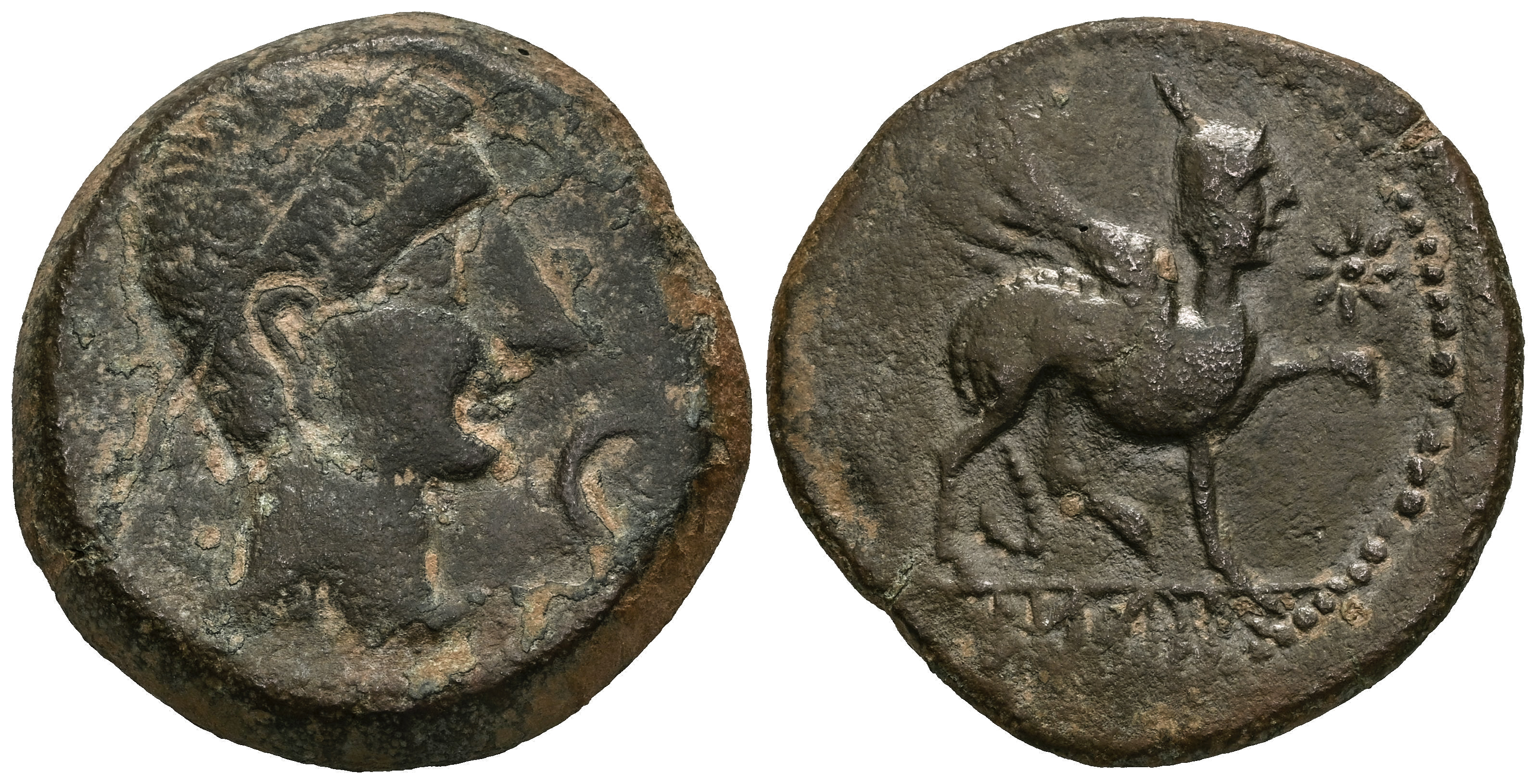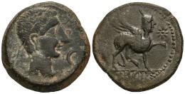 Kastilo-Castulo. Unit. 180 BC. Cazlona (Jaén). (Abh-702). (MIB-157/28a). (Acip-2136). Anv.: Diademed male head right, crescent before. Rev.: Sphinx right, star before, KASTILO below. Ae. 13,99 g. Almost VF/VF. Est...60,00.