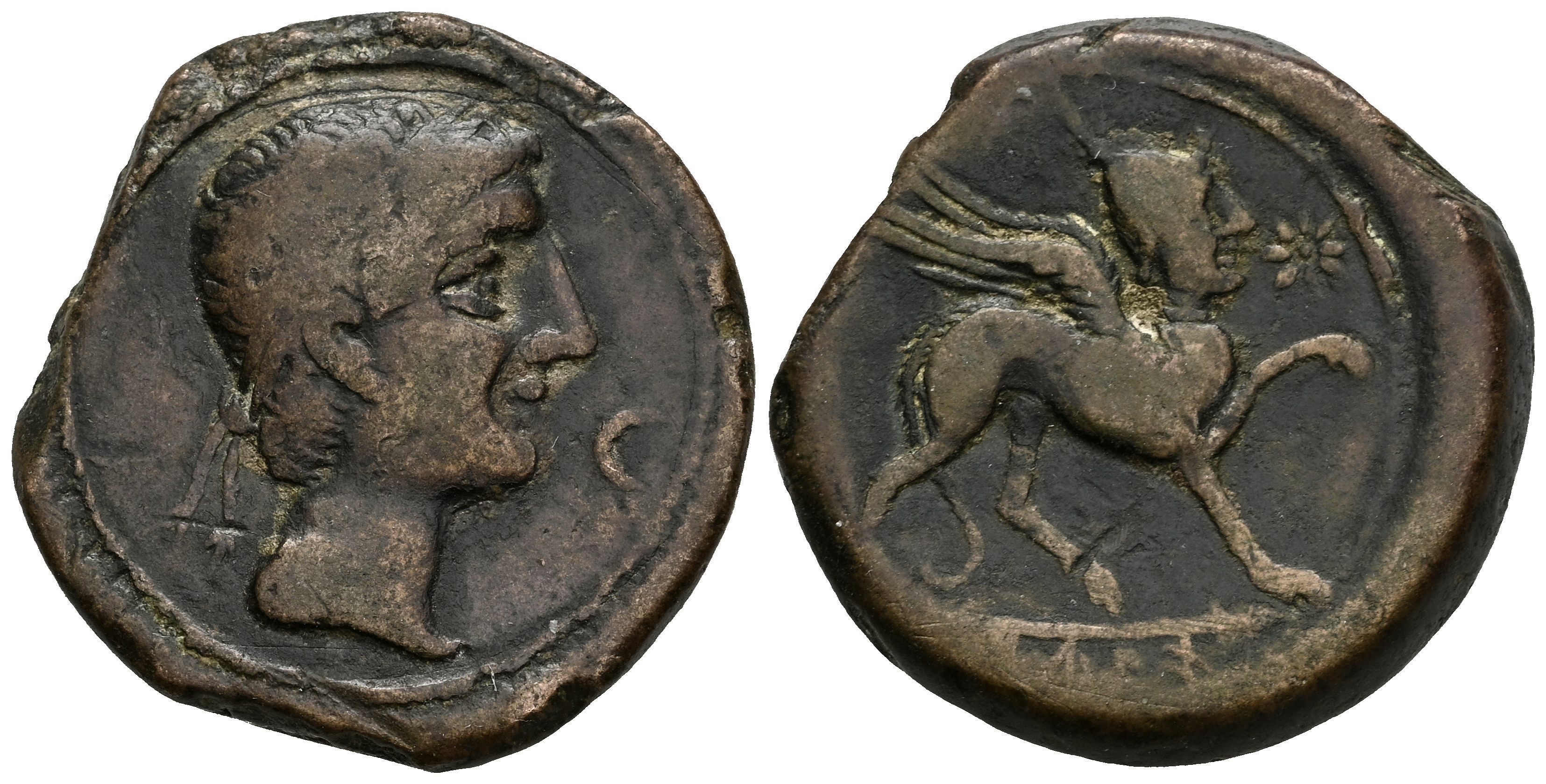 Kastilo-Castulo. Unit. 180 BC. Cazlona (Jaén). (Abh-702). (Acip-2136). (C-32). Anv.: Diademed male head right, crescent before. Rev.: Sphinx right, star before, KASTILO below. Ae. 16,78 g. Choice F. Est...35,00.