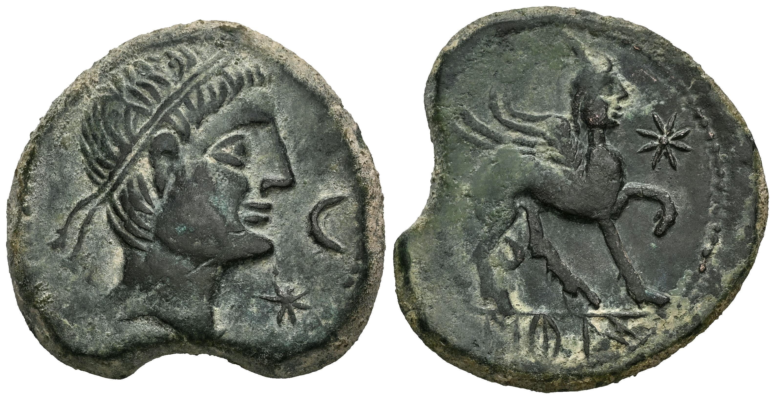 Kastilo-Castulo. Unit. 180 BC. Cazlona (Jaén). (Abh-Unlisted). (MIB-157/36b). (Acip-2141). Anv.: Diademed male head right, crescent and star below, before. Rev.: Sphinx right, star before. Ae. 13,94 g. A good sample. Irregular edge. Very rare, even more in this grade. Almost XF/Choice VF. Est...120,00.