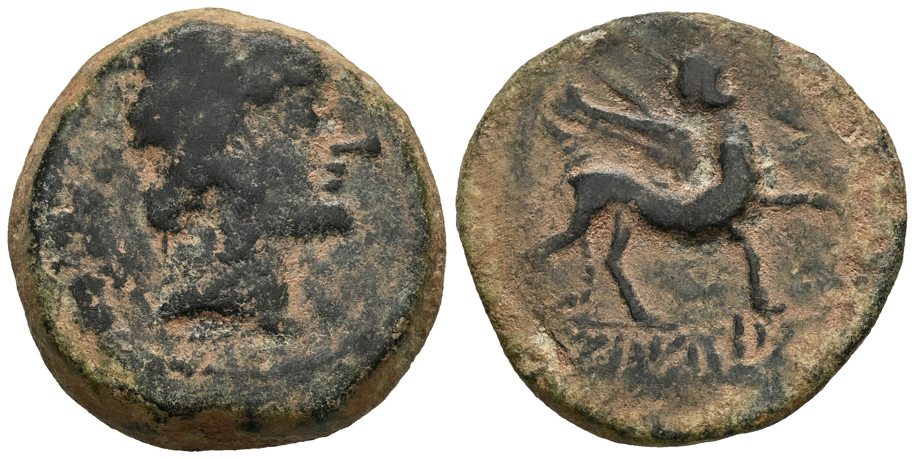 Kastilo-Castulo. Unit. 180 BC. Cazlona (Jaén). (Abh-Unlisted). (MIB-157/37a). (Acip-2112 (R9)). Anv.: Laureate male head right. Rev.: Sphinx right, star before, legend KASTILO below. Ae. 13,79 g. Very rare. Choice F/VF. Est...180,00.