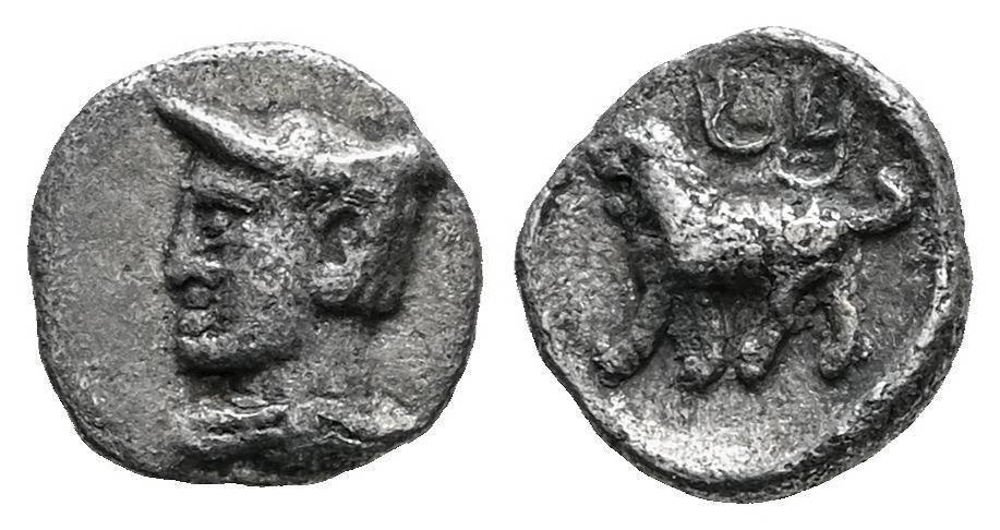 Cilicia. Uncertain. Hemiobol. 4th Century BC. (Troxell & Kagan-26). Anv.: Draped bust of Hermes to right, wearing petasos. Rev.: BL ("Baal") in Aramaic Lion walking to left. Ag. 0,33 g. Very rare. VF. Est...150,00.