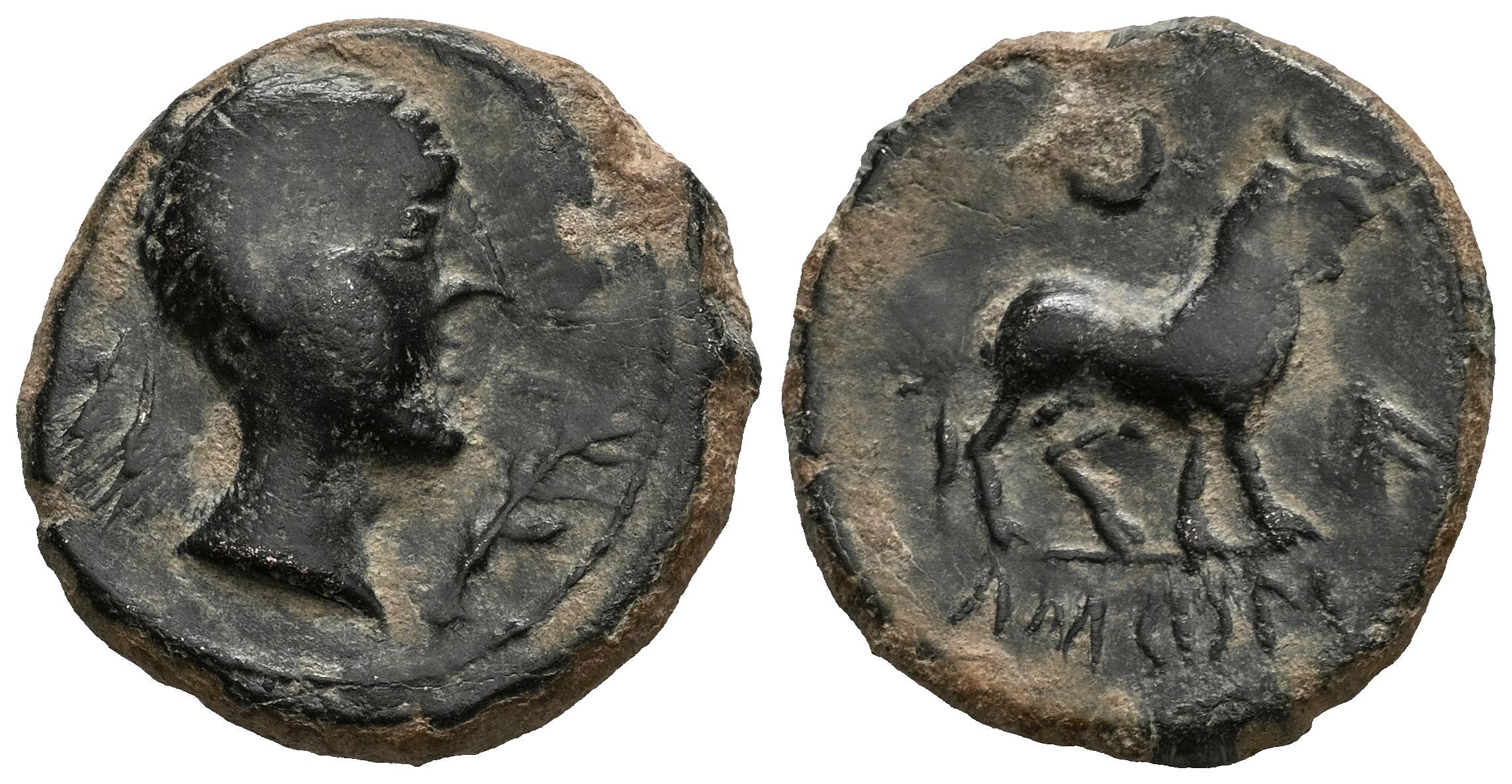 Kastilo-Castulo. Half unit. 180 BC. Cazlona (Jaén). (Abh-720). (MIB-157/46). (Acip-2149). Anv.: Diademed male head right, palm before. Rev.: Bull right, crescent above, iberian letter KA before and legend KASTILO below line. Ae. 4,87 g. VF. Est...50,00.