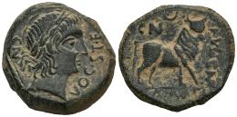 Kastilo-Castulo. Half unit. 180 BC. Cazlona (Jaén). (Abh-728). (MIB-157/53b). (Acip-2119). Anv.: CN. VOC. S. T. F. Diademed male head right. Rev.: Bull right, crescent above, iberian legend KASTILO below, CN. FVL. CN. F around. Ae. 11,23 g. Choice VF/VF. Est...70,00.