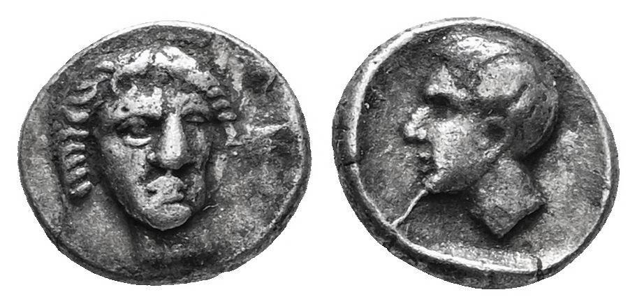 Cilicia. Hemiobol. 4th Century BC. Uncertain mint. Anv.: Female head slightly turned to the right. Rev.: Young male head turned to the left. Ag. 0,38 g. We found no references for this type. Rare. Choice VF. Est...90,00.