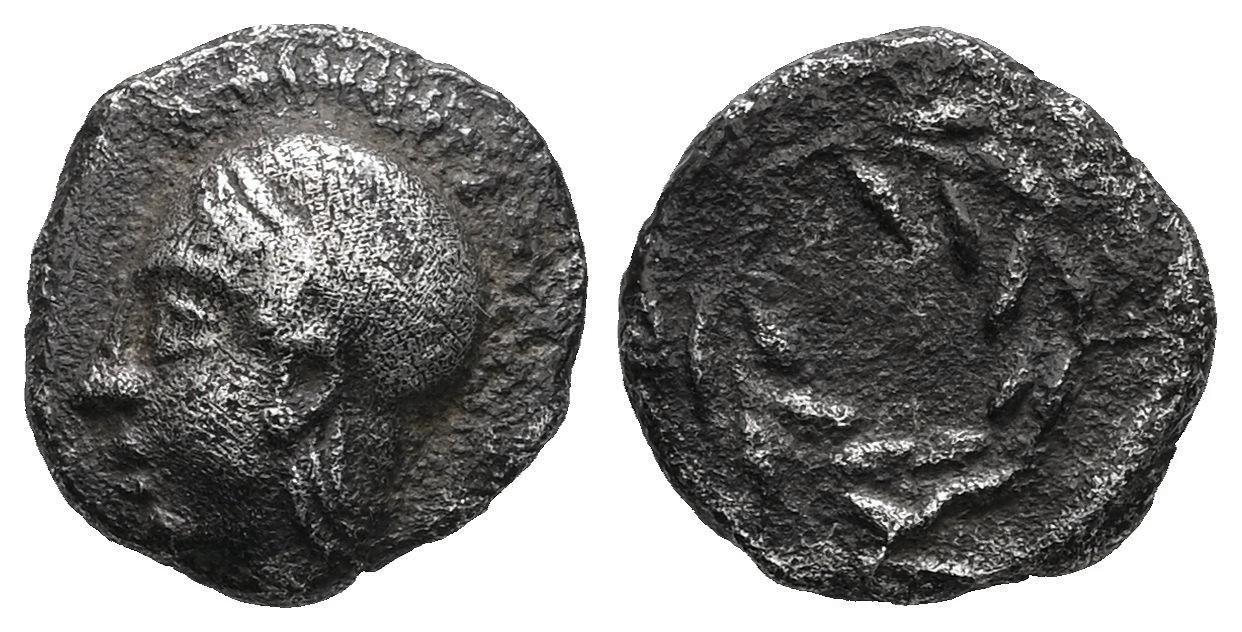 Aiolis. Elaia. Obol. 450-400 BC. (Sng Cop-166). (Sng Ashmolean-1432/3). Anv.: Head of Athena in crested Attic helmet to left. Rev.: Ε-Λ-Α-I, olive wreath tied below. Ag. 1,20 g. Patina. VF. Est...60,00.