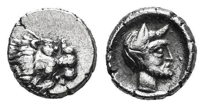Cilicia. Uncertain. Tetartemorion. Early-mid 4th century BC. (Troxell & Kagan-8). Anv.: Facing lion’s head. Rev.: Bearded head of satyr right within incuse circle. Ag. 0,17 g. A good sample for this type. XF/Almost XF. Est...100,00.