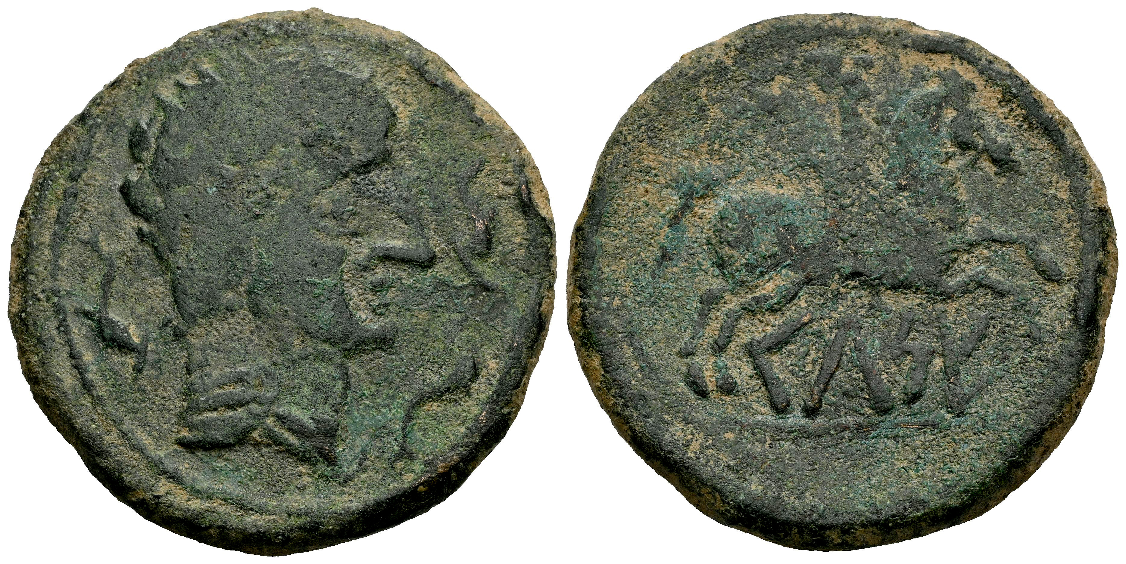 Kelse-Celsa. Unit. 120-50 BC. Velilla de Ebro (Zaragoza). (Abh-771). (MIB-69/16 ID 107592, Plate Coin). Anv.: Male head right with cloak and fibula, three dolphins around. Rev.: Horseman right, holding palm, iberian legend KELSE below. Ae. 19,73 g. Crude art. Large module. Ex Tauler&Fau 56 (29/04/2020), lot 13. Almost VF. Est...100,00.