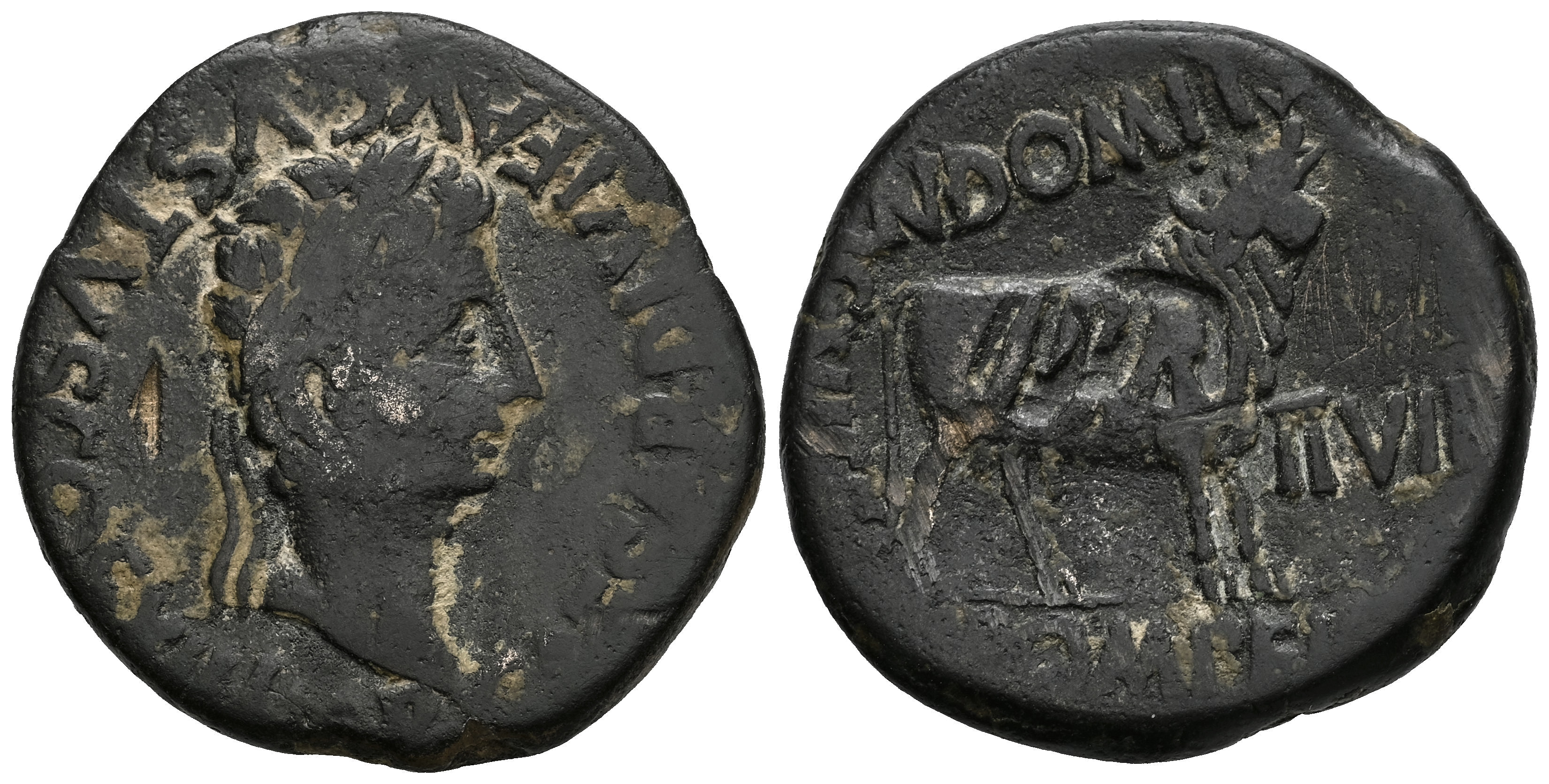 Kelse-Celsa. Augustus period. Unit. 27 BC - 14 AD. Velilla de Ebro (Zaragoza). (Abh-813). (Tesorillo-Type 4/56). Anv.: IMP. CAESAR. DIVI. F. AVGVSTVS. COS. XII. Laureate head of Augustus right. Rev.: Bull standing right, legend CN. DOMITIO. C. POMPEI. II. VIR. C. V. I. CELS. Ae. 13,75 g. Countermark "PR" inside irregular cartouche on the reverse. Almost VF. Est...70,00.