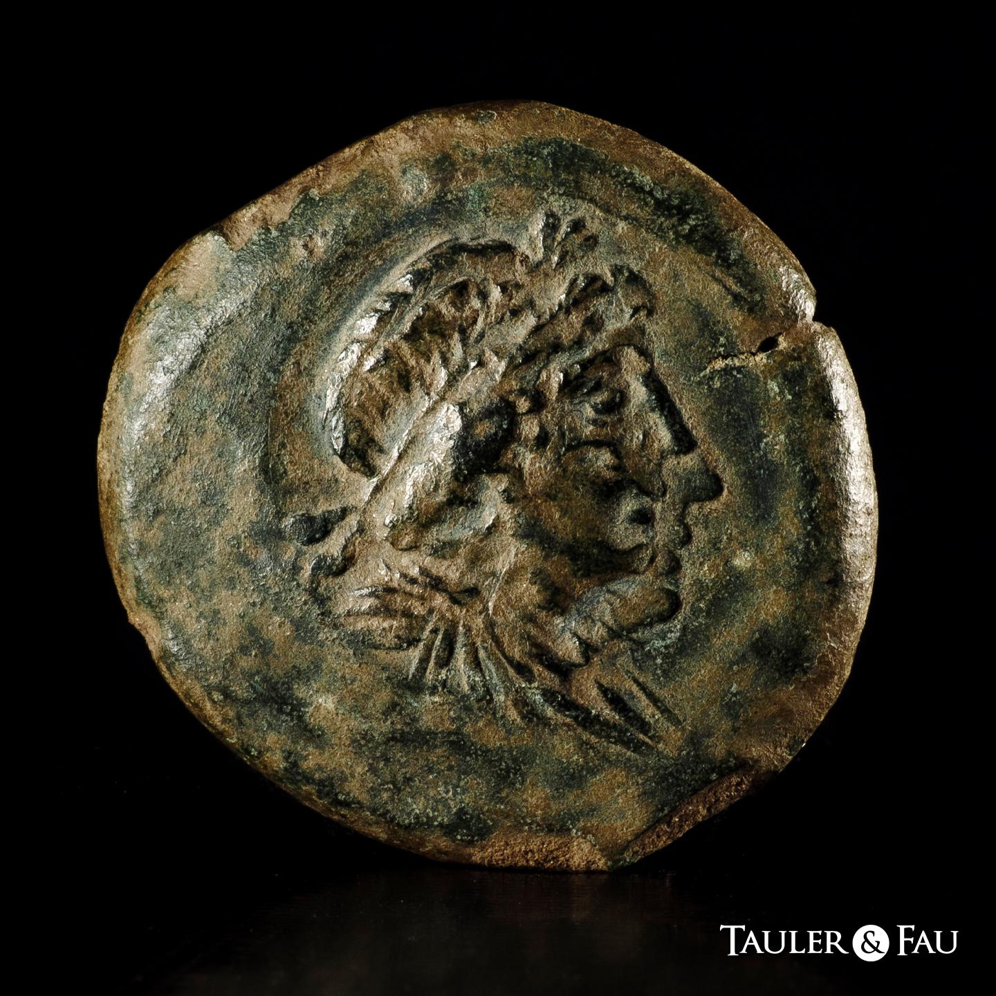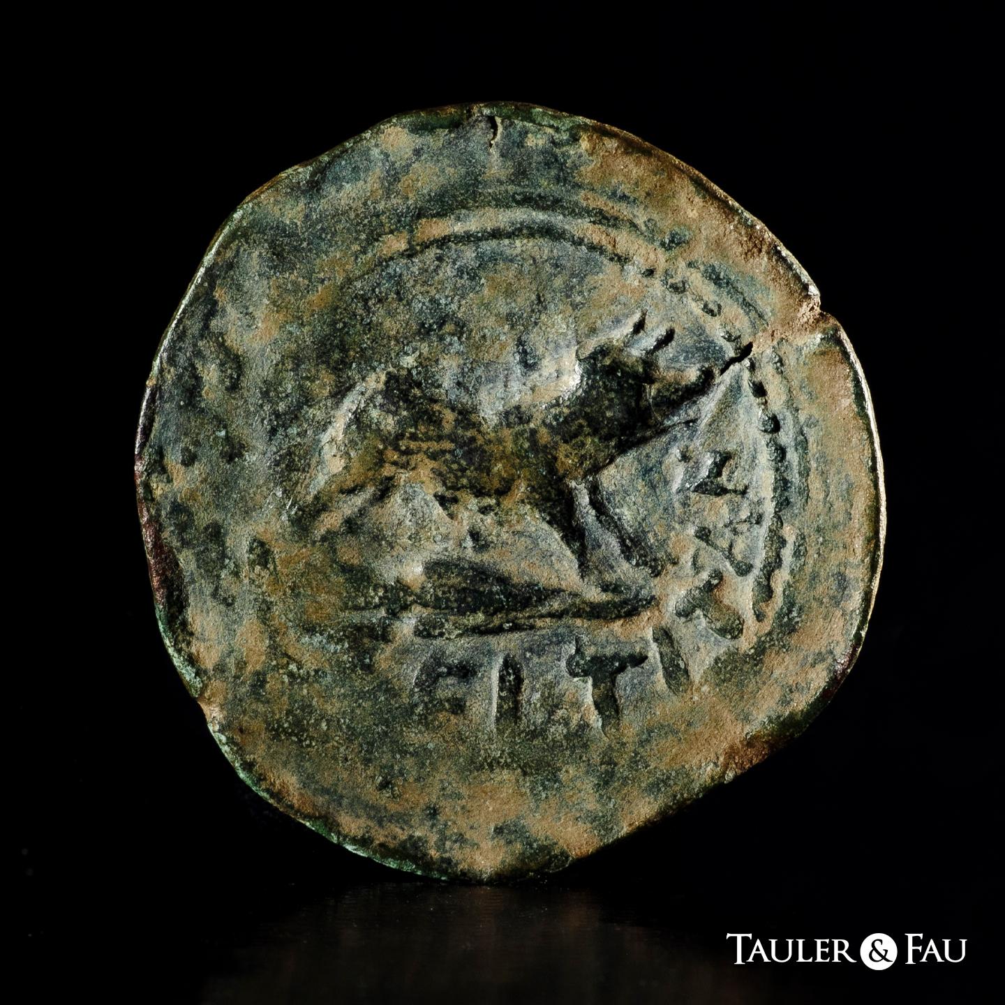 Celtitan. Unit. 50 BC. Peñaflor (Sevilla). (Abh-822). (MIB-211/1). (Acip-2427). Anv.: Laureate head right. Rev.: Boar right, on spearhead (?), latin legend CELTITAN below. Ae. 23,48 g. Double struck on obverse. Rare. VF. Est...350,00.