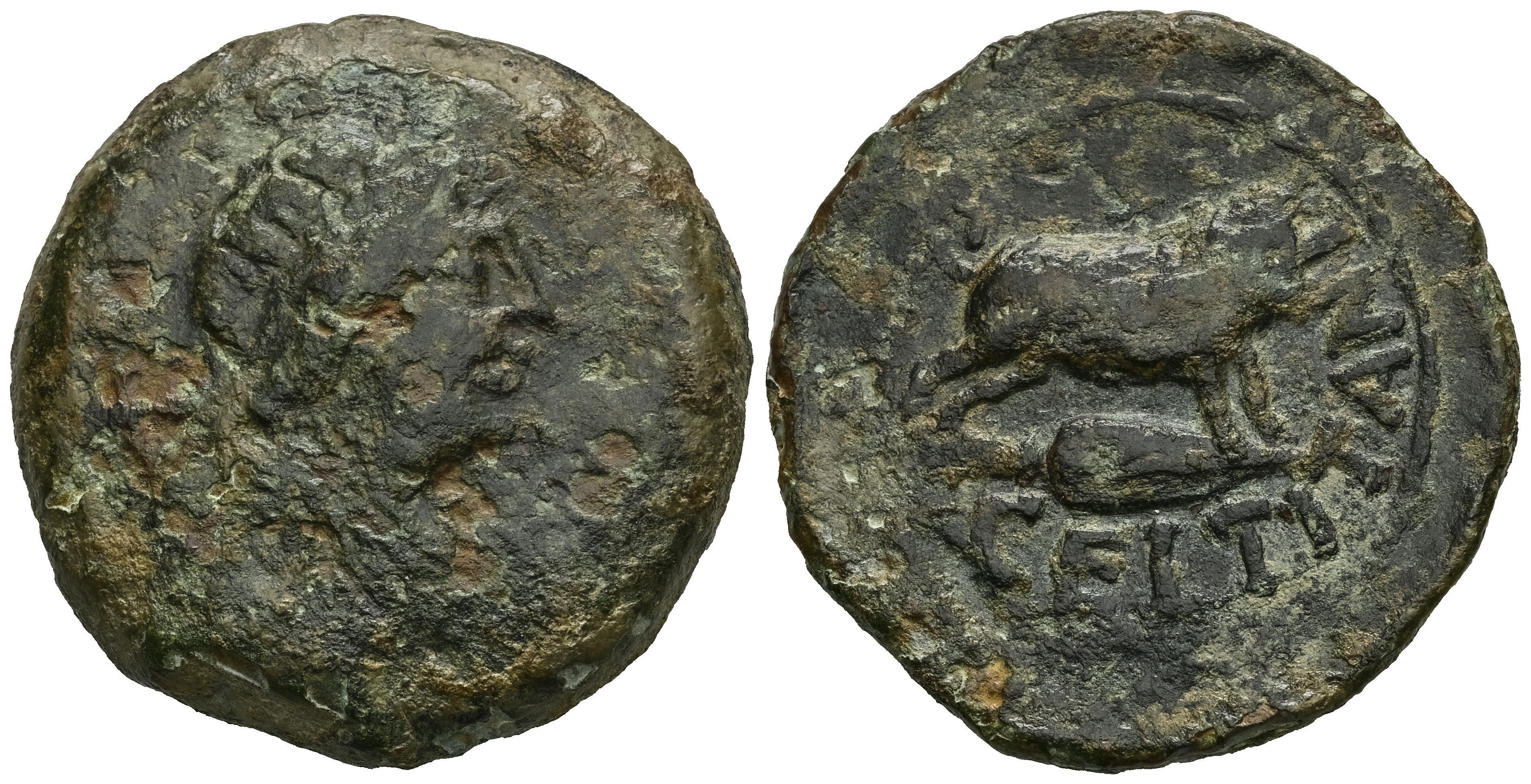 Celtitan. Unit. 50 BC. Peñaflor (Sevilla). (Abh-822). (MIB-211/1). (Acip-2427). Anv.: Laureate head right. Rev.: Boar right, on spearhead (?), latin legend CELTITAN below. Ae. 24,43 g. Rust on obverse and nice reverse. Rare. Ex J. Vico / Pliego (20/11/2002), lot 46. Included original label. Almost F/Almost VF. Est...200,00.