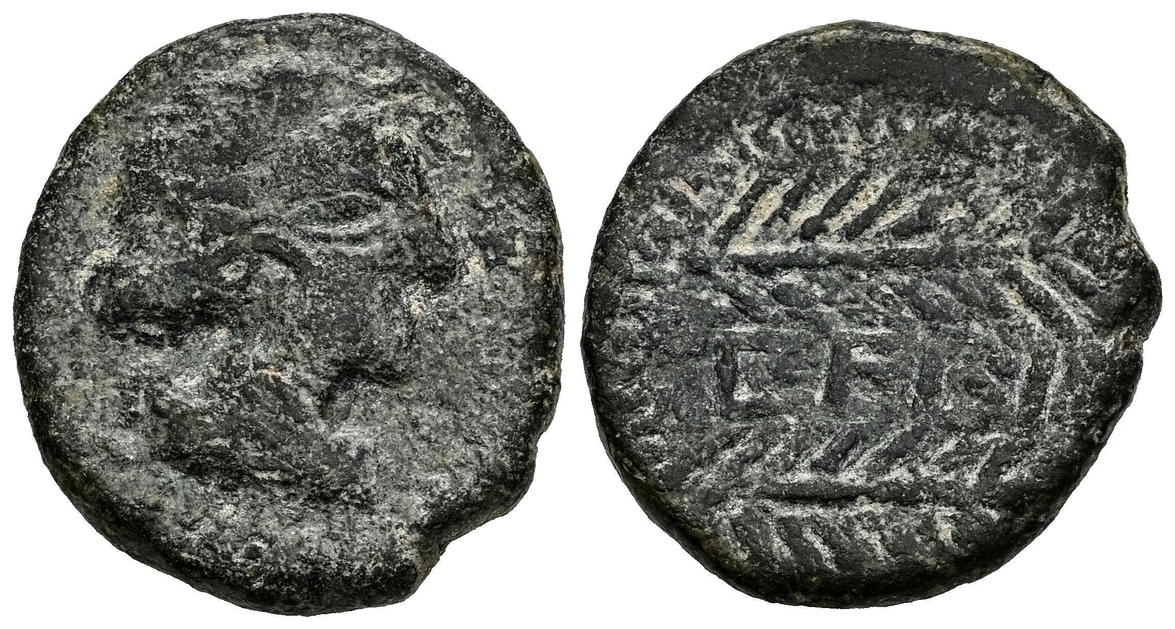 Cerit. Half unit. 50 BC. Jerez de la Frontera (Cádiz). (Abh-824). (MIB-185/2). (Acip-2414). Anv.: Laureate head right. Rev.: Palms right, CERI in between. Ae. 5,89 g. Scarce. F/Choice F. Est...60,00.