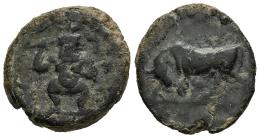 Ebusus. 1/4 calco. 200-100 BC. Ibiza. (Abh-923). (MIB-16/40). (Acip-719). Anv.: Bes wearing skirt, holding mace and snake. Rev.: Bull charging left. Ae. 3,34 g. Almost VF. Est...70,00.
