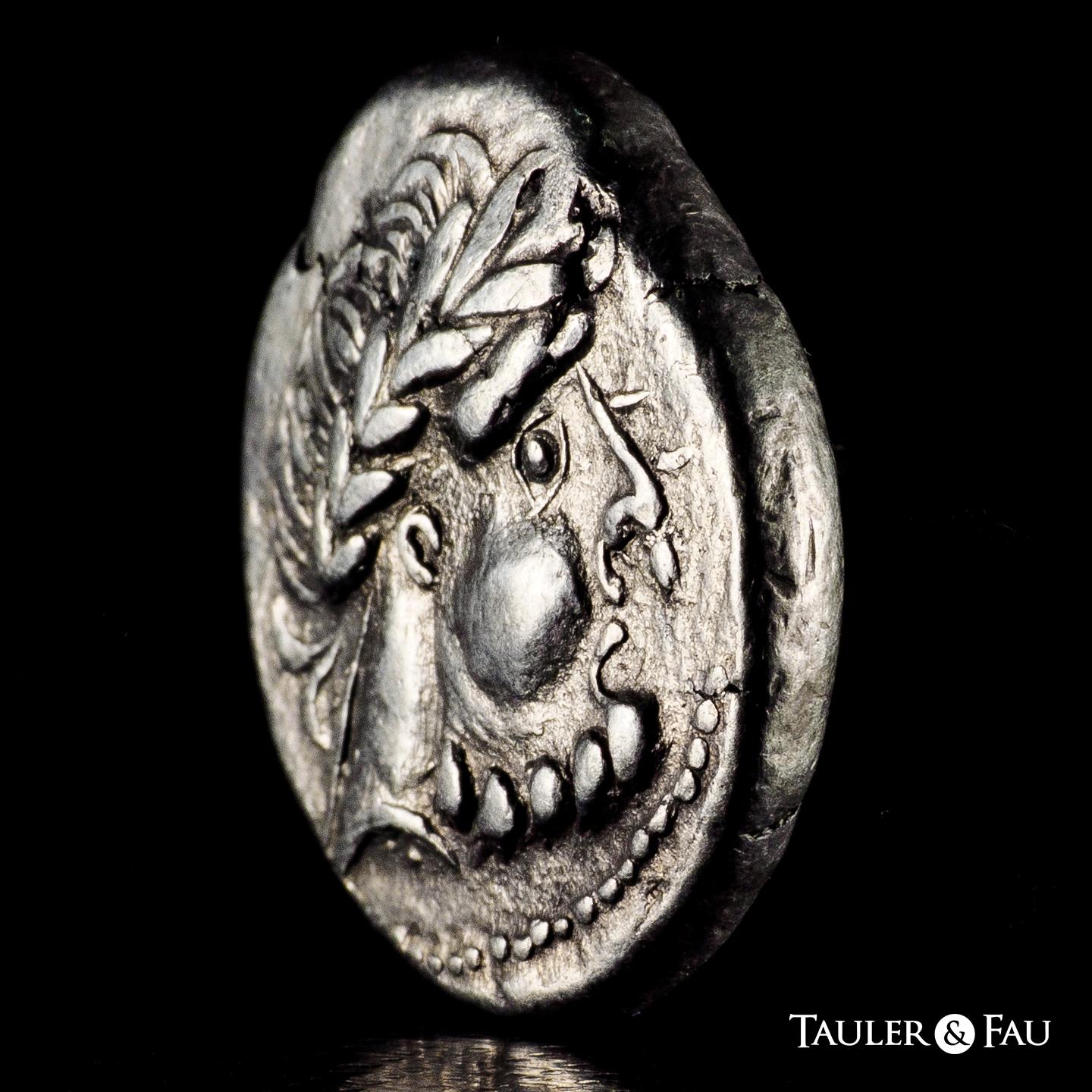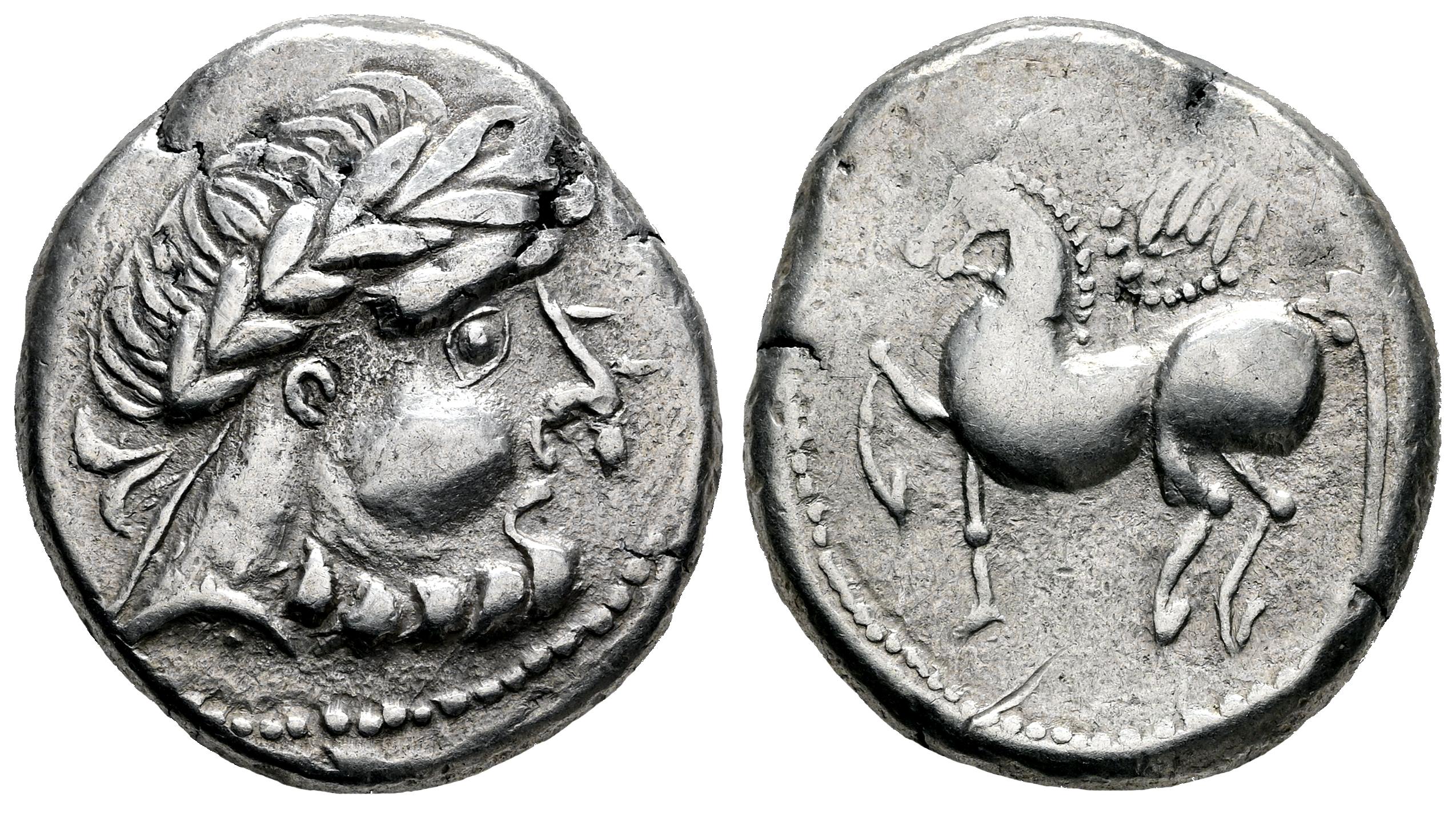 Middle Danube. Uncertain tribe. Tetradrachm. 2nd century BC. 'Kugelwange ohne Ringel' type, imitating Philip II of Macedon. (OTA-191/1). (Lanz-461). Anv.: Celticized laureate head of Zeus to right. Rev.: Celticized Pegasos prancing left. Ag. 11,85 g. Rare. Ex Num. Naumann 93 (06/09/2020), lot 6. Choice VF/VF. Est...400,00.