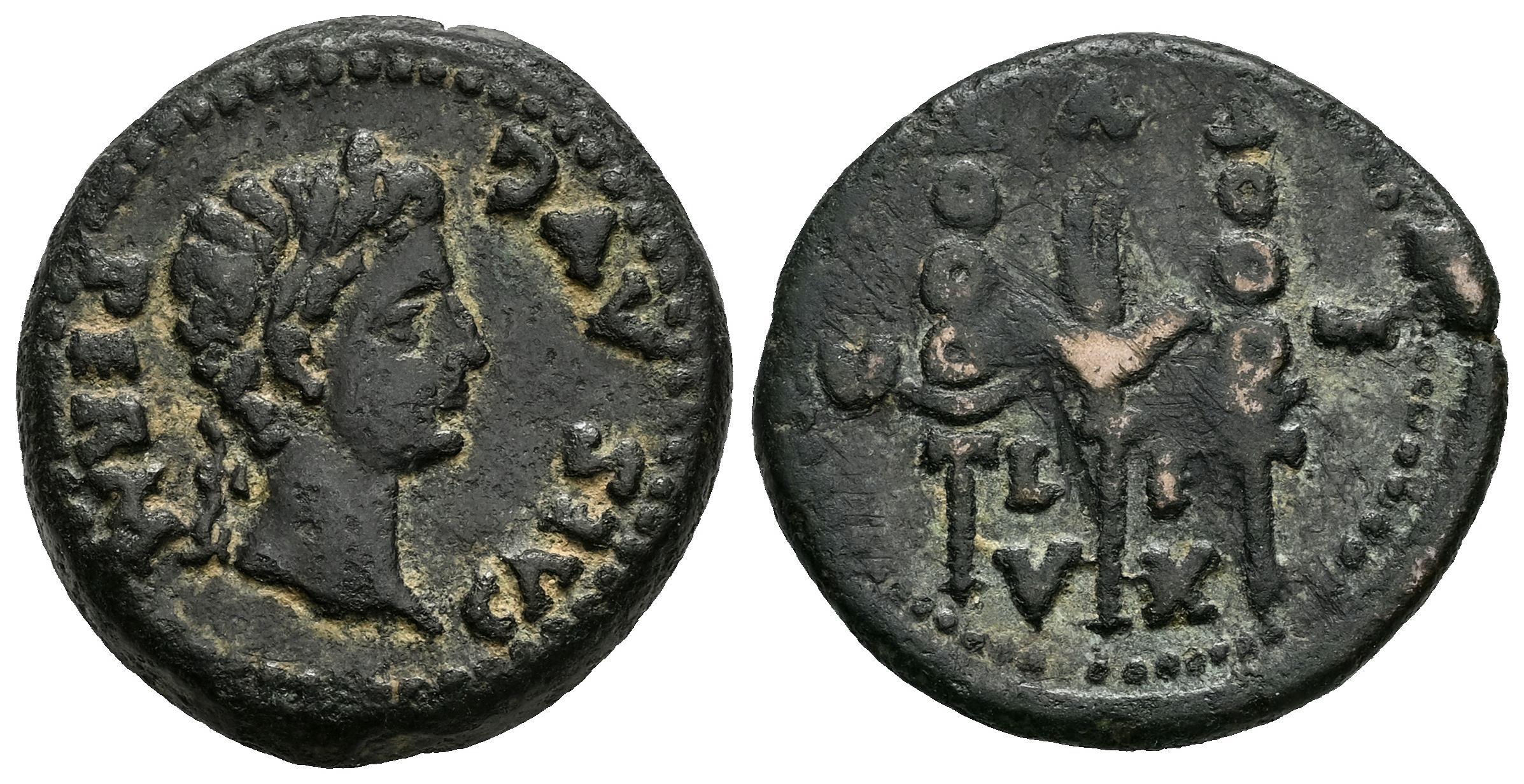 Emerita Augusta. Augustus period. Half unit. 22 BC - 14 AD. Mérida (Badajoz). (Abh-1016). (Acip-3379). Anv.: PERM. CAES. AVG. Laureate head of Augustus right. Rev.: Eagle between standards, LE. VX. below, C.A.E around. Ae. 6,41 g. Choice VF/Almost VF. Est...70,00.