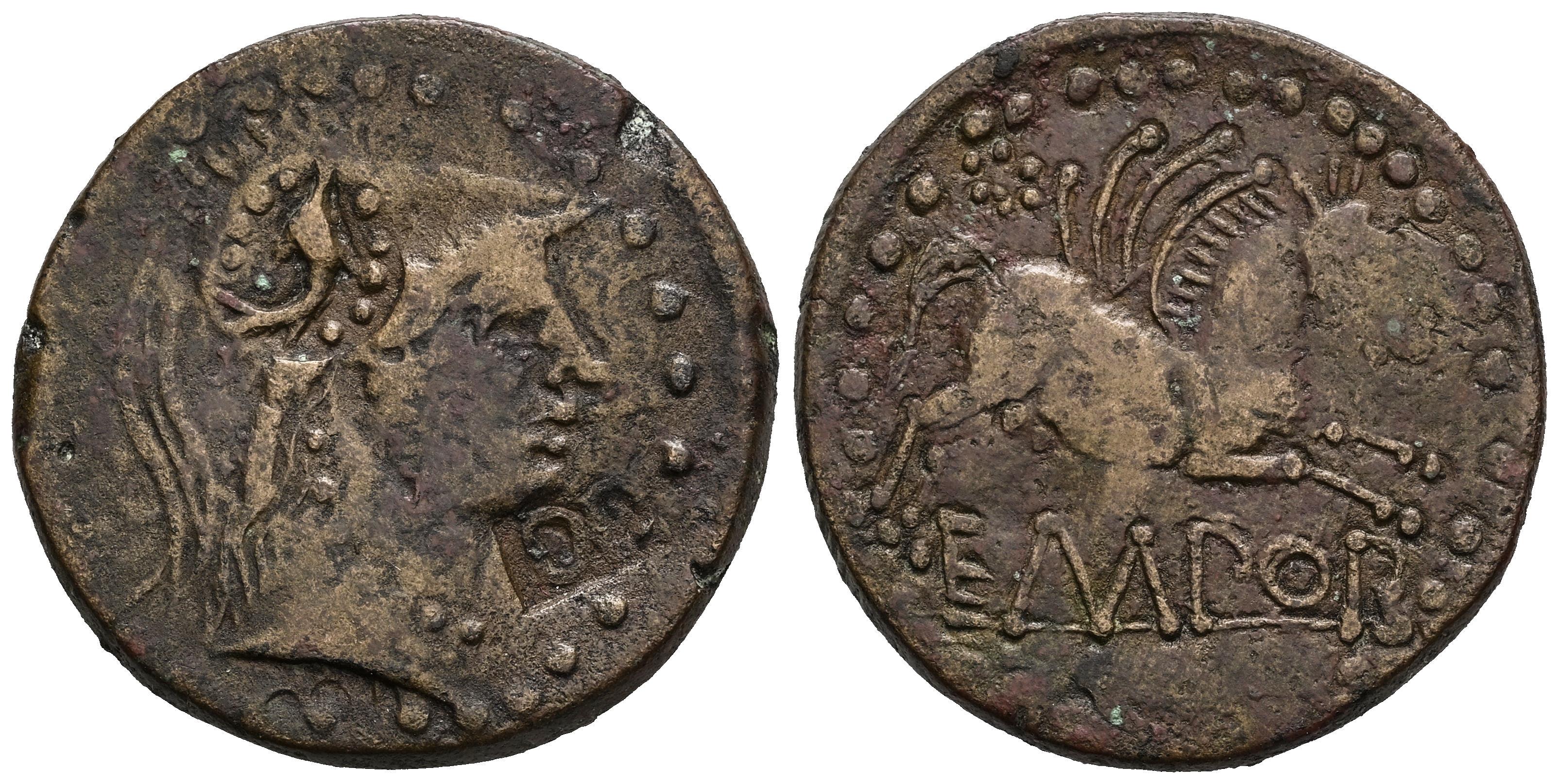 Emporiton. Unit. 50-27 BC. L’Escala, Ampurias (Girona). (Abh-1247). Anv.: Head of Pallas right. Rev.: Pegasus right, laurel wreath above, EMPOR below. Ae. 10,78 g. Countermarks of "Dolphin or porpoise" within a circular cartouche with pelletted frame and "D.D" within a rectangular cartouche, both on the obverse. Almost VF/VF. Est...100,00.