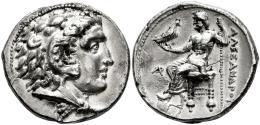 Ptolemaic Kings of Egypt. Ptolemy I Soter, as satrap. Tetradrachm. 320/19-311/0 BC. Arados. In the name and types of Alexander III of Macedon. (Price-3426 Byblos). (Müller-1375). (AJN-32, Series 4). Anv.: Head of Herakles to right, wearing lion skin headdress. Rev.: Zeus Aëtophoros seated to left, holding sceptre; AΛEΞANΔPOY to right, AP (civic monogram) in left field. Ag. 16,79 g. A good sample. XF/Almost XF. Est...800,00.