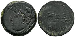 Gades-Gadir. Augustus period. Dupondius. 27 BC - 14 AD. Cadiz. (Abh-1378). (Acip-3323). Anv.: Head of Hercules left, club behind. Rev.: Winged sheaf of rays, AVGVSTV(S) above, DIVI. F below. Ae. 17,61 g. Tooled and smoothed. Scarce. Choice VF/Almost VF. Est...100,00.