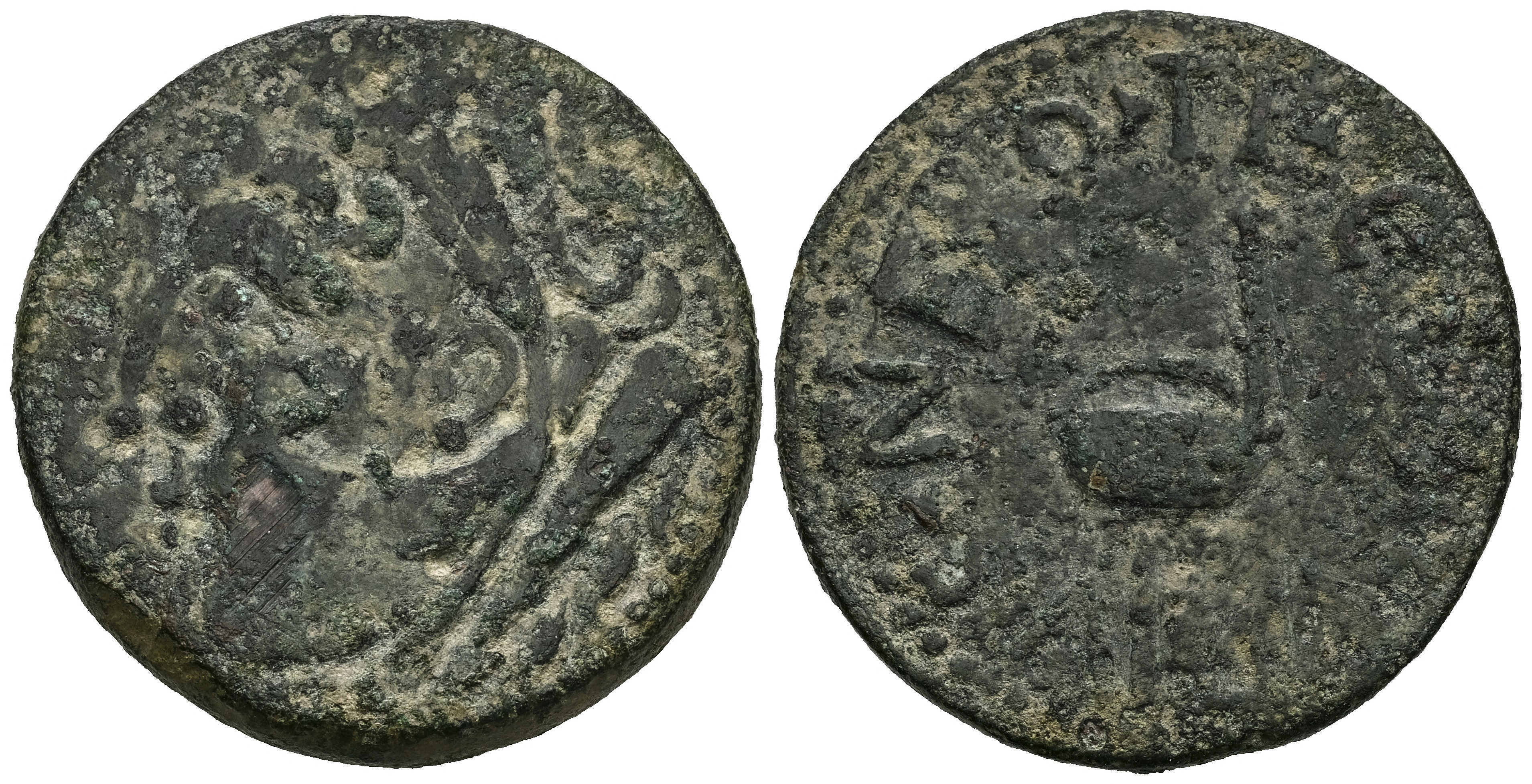 Gades-Gadir. Augustus period. Dupondius. 27 BC - 14 AD. Cadiz. (Abh-1381). (Acip-3321d). Anv.: Head of Hercules left, club behind. Rev.: Simpulum left, TI. CLAVIDIVS. NERO around. Ae. 18,69 g. Rare. Almost VF. Est...90,00.