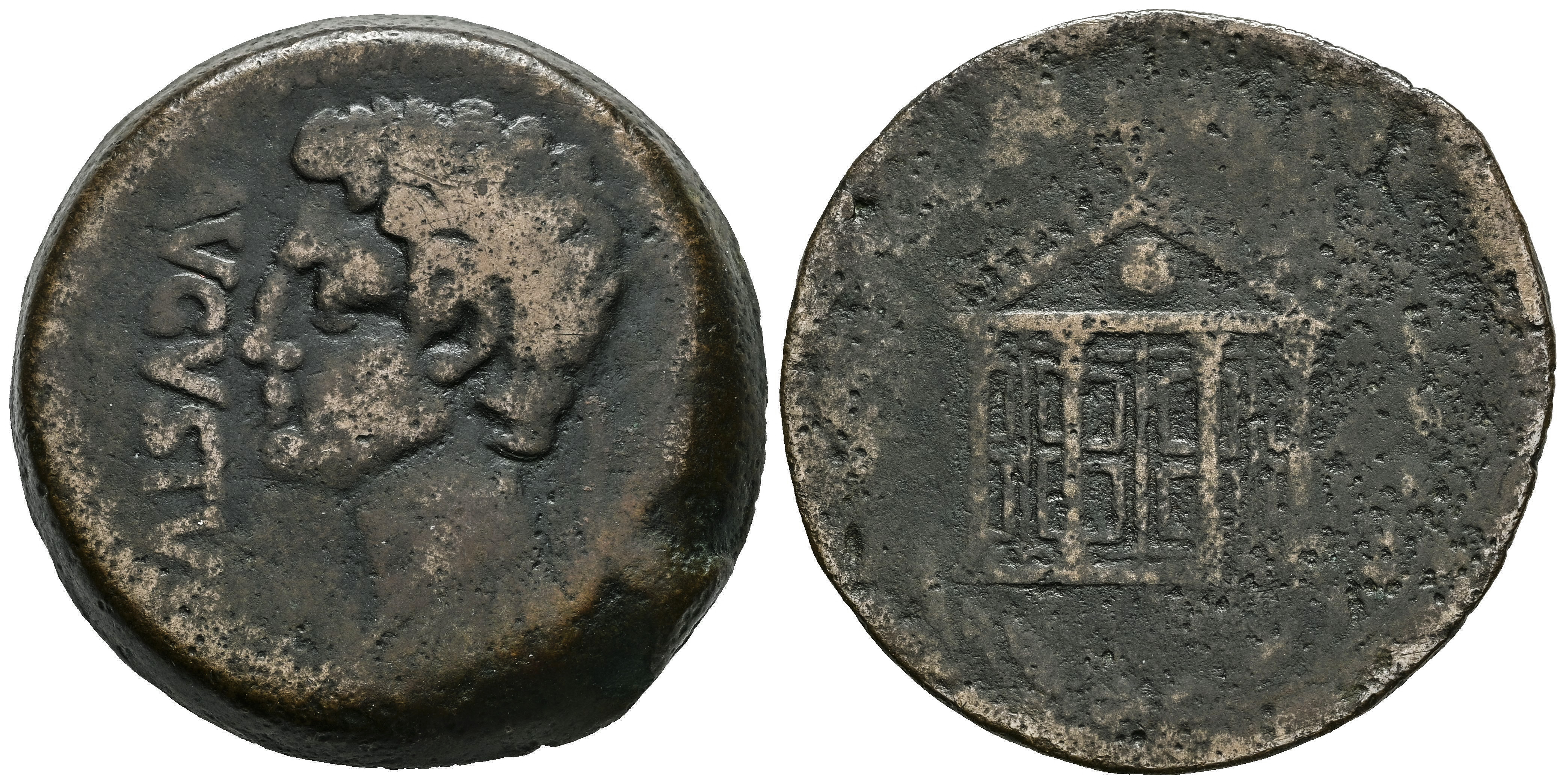 Gades-Gadir. Augustus period. Dupondius. 27 BC - 14 AD. Cadiz. (Abh-1385). (Acip-3325). Anv.: Bare head of Augustus left, AVGVSTV(S) before. Rev.: Tetrastyle temple within laurel wreath. Ae. 31,86 g. Good specimen for this mint. Very rare. VF/Choice F. Est...250,00.