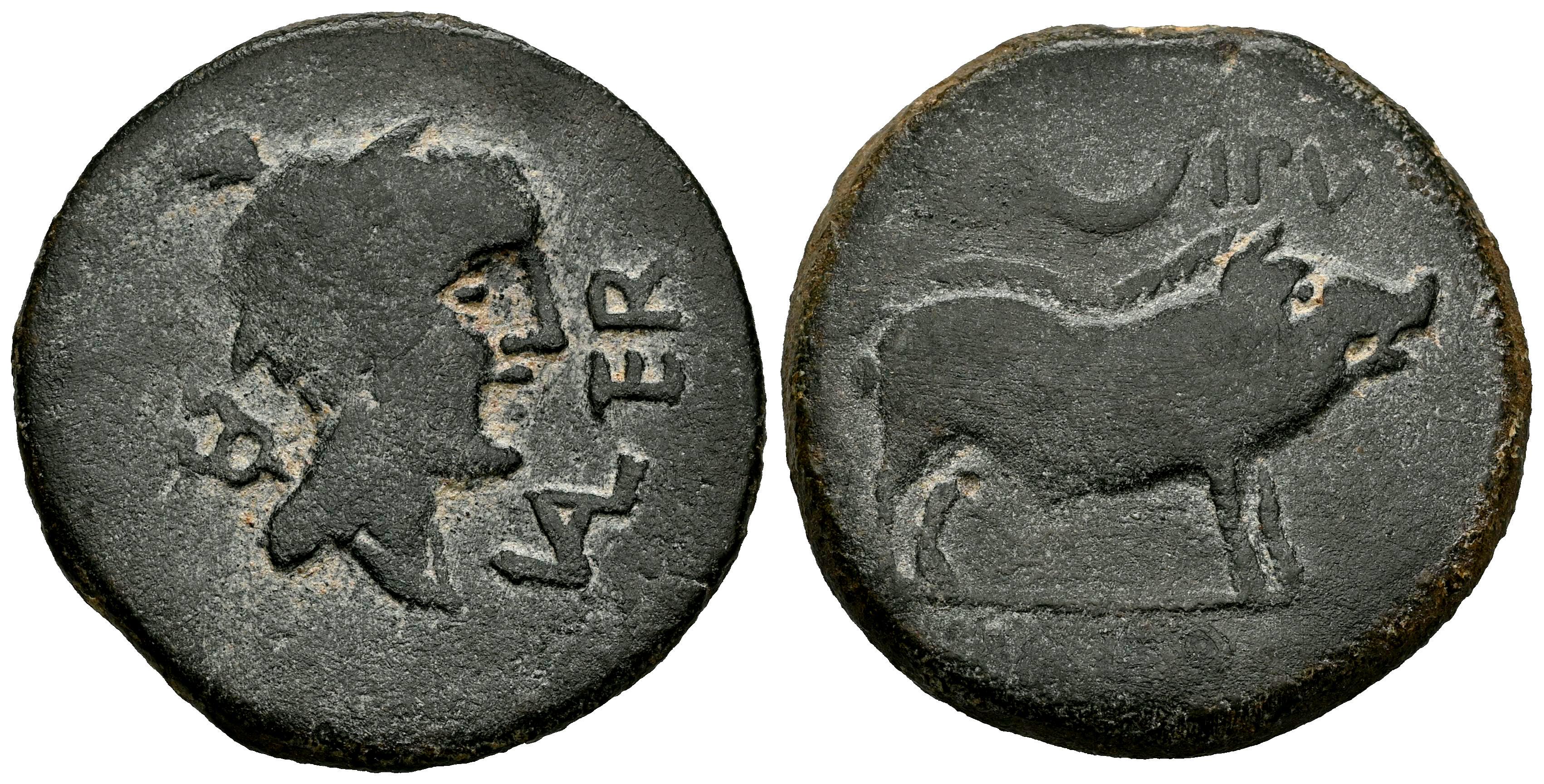 Halos. Unit. 50 BC. Osuna (Sevilla). (Abh-1393). (MIB-205/1). (Acip-2428). Anv.: Head of Mercury right, caduceus behind, VAL. TER before. Rev.: Boar right, crescent between (IL). IPV above, (HALOS) below. Ae. 15,73 g. Rare. Almost VF. Est...250,00.