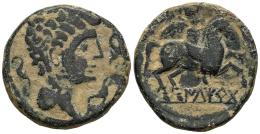Iltirta. Unit. 200-20 BC. Lleida (Cataluña). (Abh-1465). Anv.: Male head right, three dolphins around. Rev.: Horseman right, holding palm and chlamys, iberian legend ILTIRTA below. Ae. 12,37 g. Serie semipesada. Almost VF. Est...150,00.