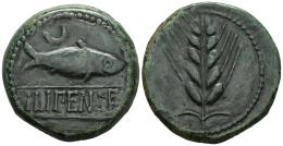 Ilipense. Unit. 120-20 BC. Alcalá del Río (Sevilla). (Abh-1531). (MIB-186/06). (Acip-2335). Anv.: Shad right, crescent above, legend ILIPENSE. Rev.: Ear of corn. Ae. 20,30 g. Tooled and smoothed. Green patina. Choice VF. Est...100,00.