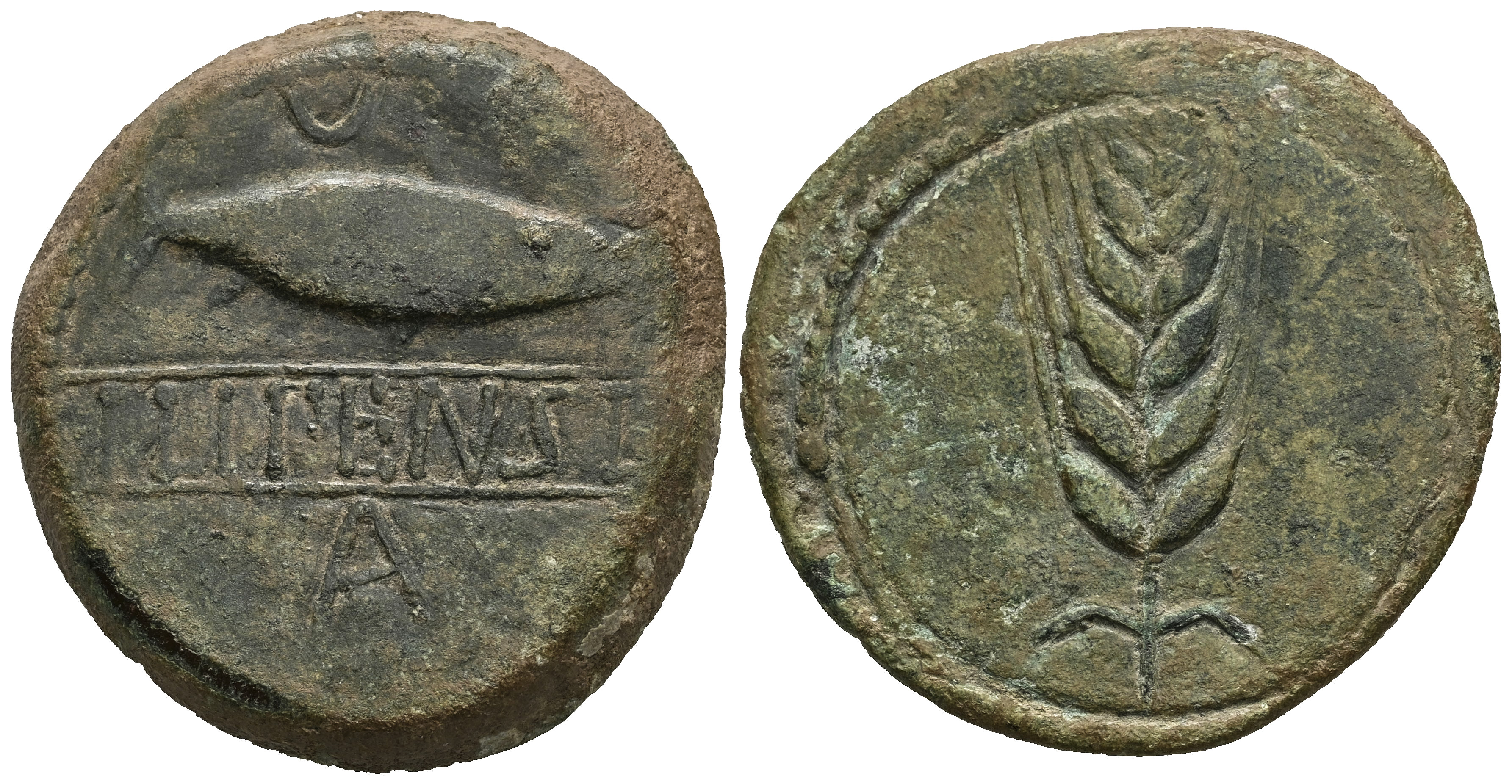 Ilipense. Unit. 120-20 BC. Alcalá del Río (Sevilla). (Abh-1532). (MIB-186/02a). (Acip-2333). Anv.: Shad right, crescent above, letter A below legend ILIPENSE. Rev.: Ear of corn. Ae. 20,35 g. Choice VF. Est...150,00.