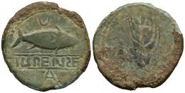 Ilipense. Unit. 120-20 BC. Alcalá del Río (Sevilla). (Abh-1532). (MIB-189/02b). Anv.: Shad right, crescent above, letter A below legend ILIPENƧE. Rev.: Ear of corn. Ae. 11,06 g. Delicate green patina, Somewhat chipped on the edge. Very rare. VF. Est...180,00.