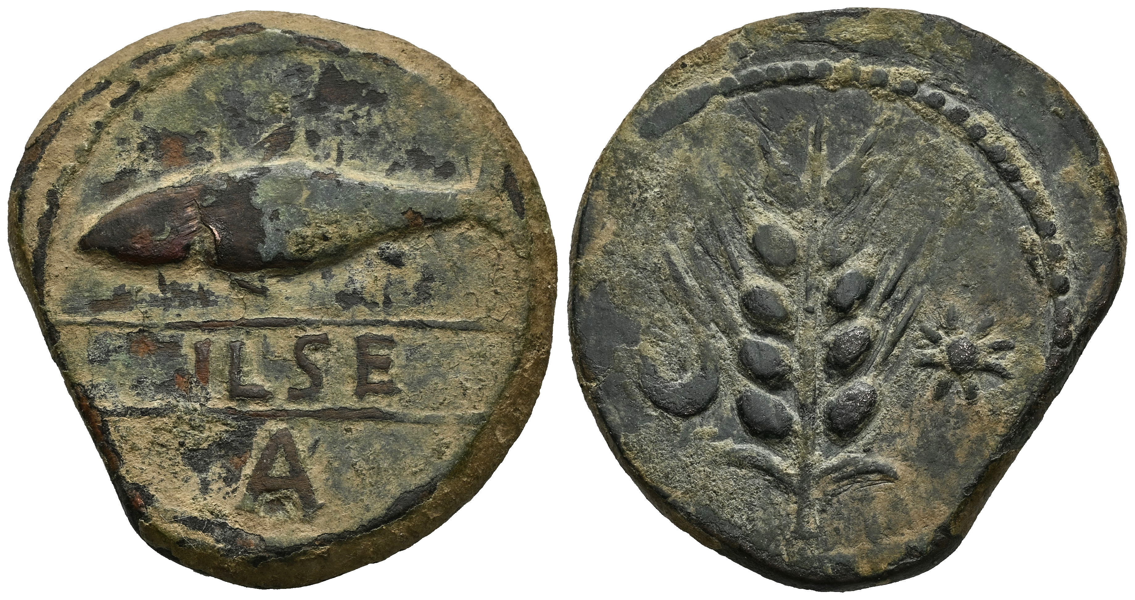 Ilse. Unit. 120-20 BC. Alcalá del Río (Sevilla). (Abh-1549). (MIB-187/2 ID 108601, Plate Coin). (Acip-2346). Anv.: Shad left above legend ILSE between lines, A below. Rev.: Ear of corn between crescent and star. Ae. 17,60 g. Knock on obverse. Very rare. Ex Áureo 85 (21/10/1997), lot 845. MIB 187/2 ID 108601, Plate Coin. VF. Est...250,00.