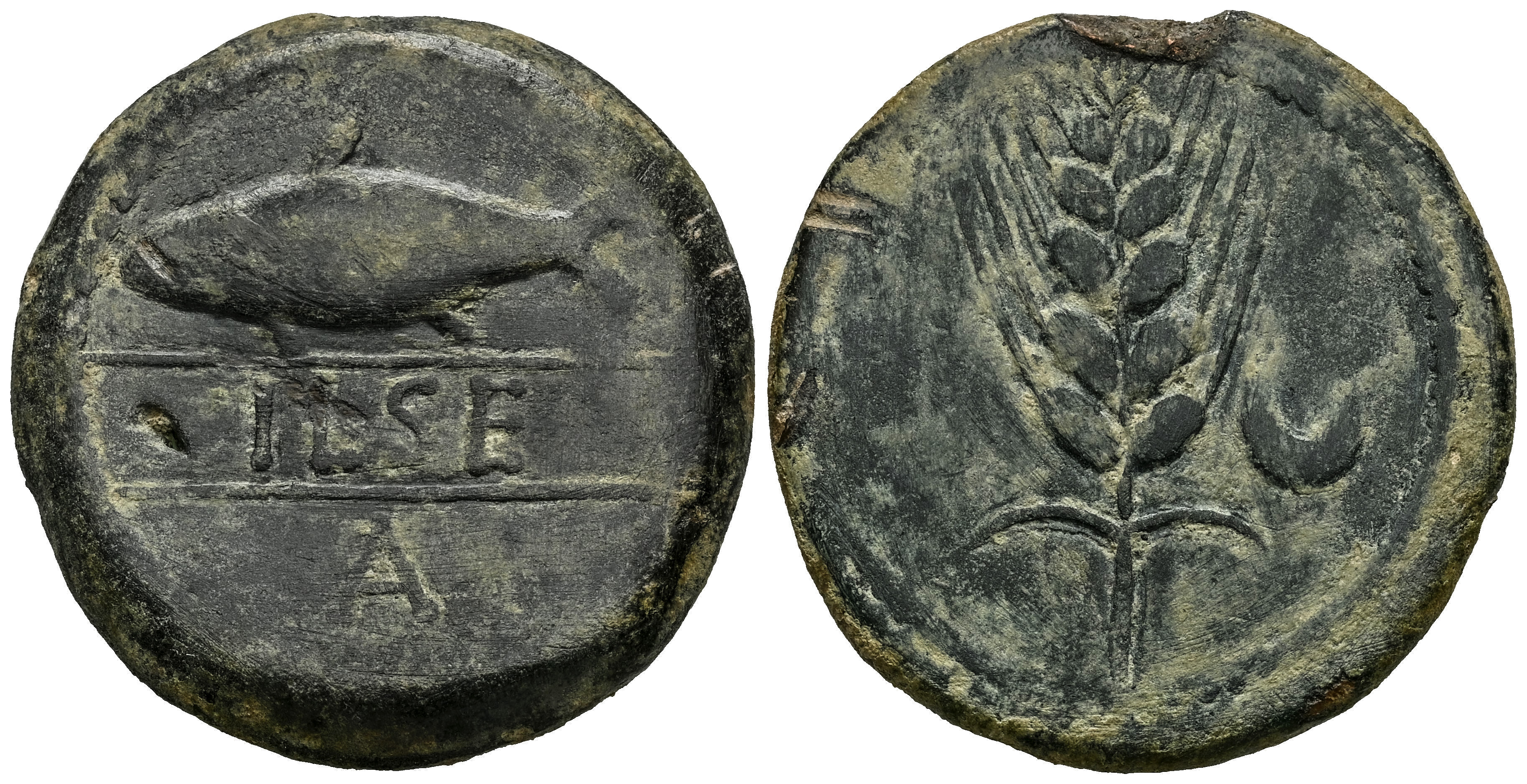 Ilse. Unit. 120-20 BC. Alcalá del Río (Sevilla). (Abh-1552). (MIB-187/1). (Acip-2345). Anv.: Shad left above legend ILSE between lines, A below. Rev.: Ear of corn and crescent. Ae. 18,80 g. Knock on edge. Rare. VF. Est...200,00.