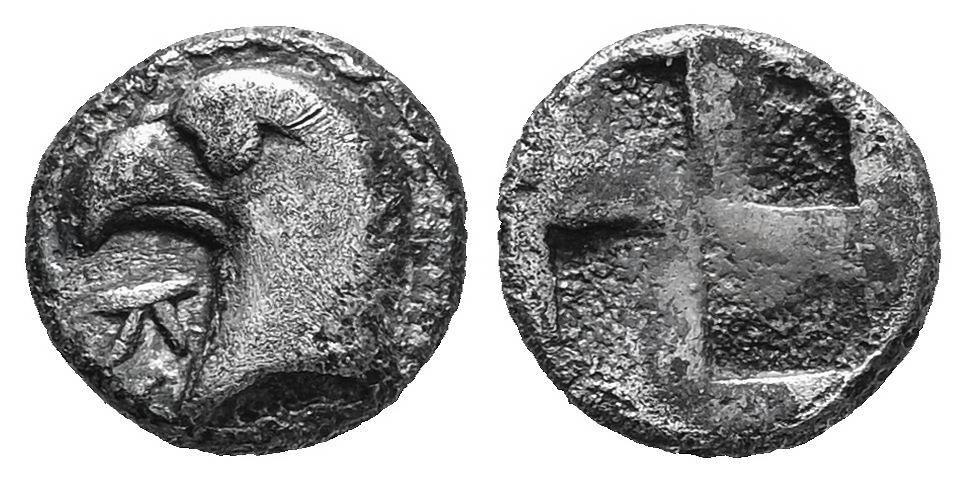 Aeolis. Kyme. Hemiobol. 450-400 BC. (Sng von Aulock-1623 var.). (Klein-333). Anv.: Head of eagle to left; KI to left, (M) below. Rev.: Quadripartite incuse square. Ag. 0,49 g. VF. Est...80,00.