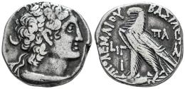 Ptolemaic Kings of Egypt. Cleopatra III and Ptolemy X Alexander I. Tetradrachm. RY 13 of Kleopatra and 10 of Ptolemy = 105/4 BC. Alexandria. (Svoronos-1729). (Sng Cop-360). (DCA-61). Anv.: Diademed head to right, wearing aegis. Rev.: ΠΤΟΛΕΜΑΙΟΥ BAΣΙΛΕΩΣ, eagle with closed wings standing to left on thunderbolt; L IΓ (Kleopatra's RY date) above Ι (Ptolemy's RY date) to left, ΠA to right. Ag. 13,87 g. Fine hairlines. Almost VF. Est...180,00.
