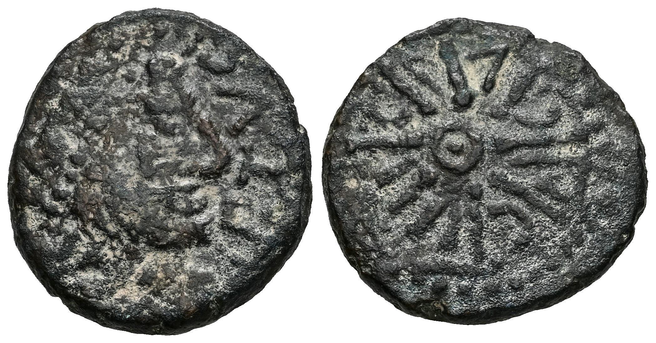 Iptuci. Half unit. 50-20 BC. Prado del Rey (Cádiz). (Abh-1572 var.). (MIB-20/3c ID 8902, Plate Coin). Anv.: Head of Jupiter right, legend IPTVCI before. Rev.: Eight spoke wheel with central circle, Libyan-Phoenician legend between them. Ae. 4,59 g.  Ex Ibercoin-Tarkis 5 (24/11/2010), lot 212. Choice F/Almost VF. Est...70,00.
