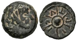 Iptuci. Cuadrante. 50-20 BC. Prado del Rey (Cádiz). (Abh-1579). (MIB-20/7). (Acip-935). Anv.: Male head right. Rev.: Six spoke wheel with central circle, IPTVCI between them. Ae. 2,25 g. Rare. Almost VF/VF. Est...100,00.