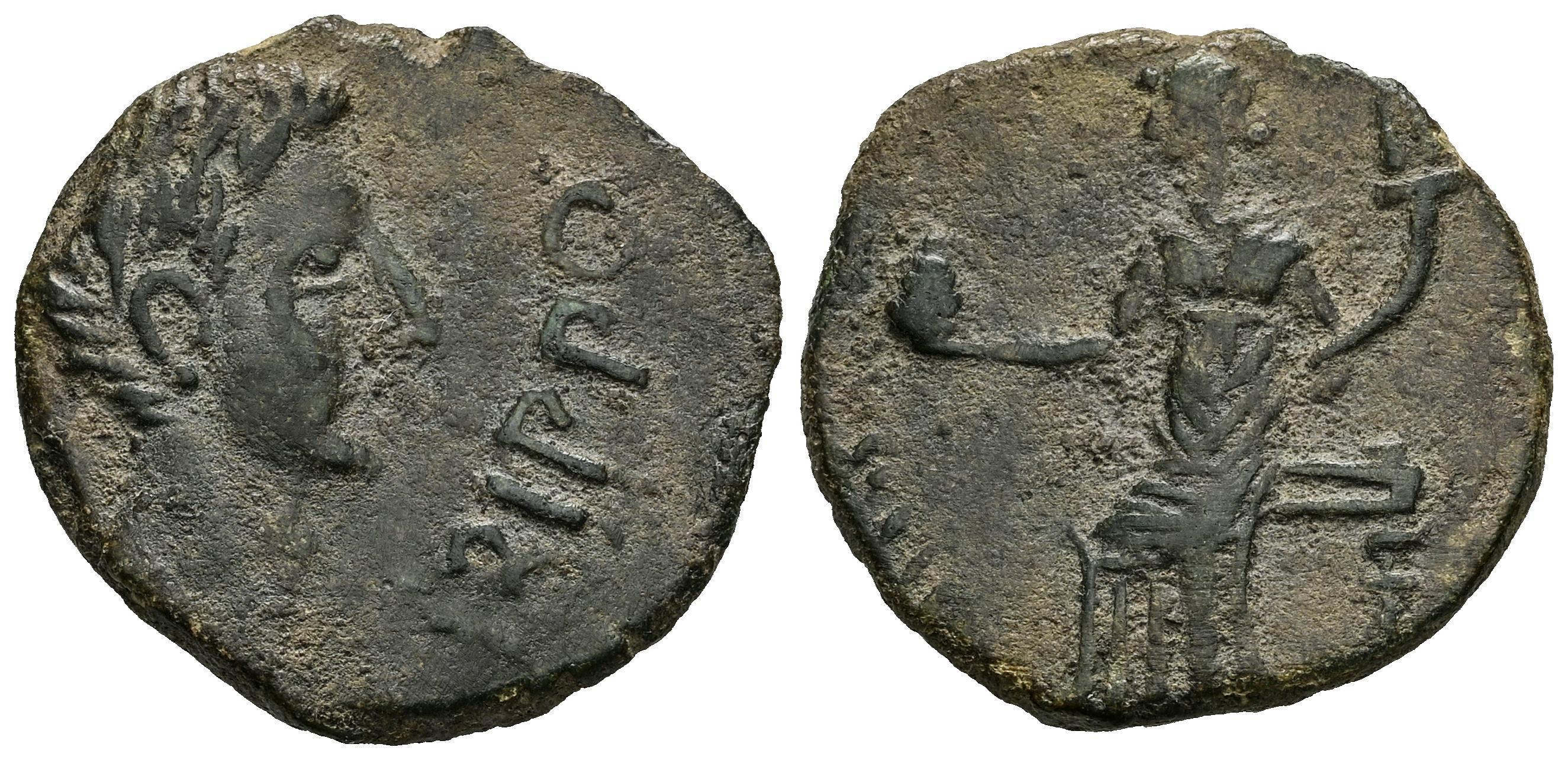 Irippo. Unit. 30 BC. South area of Sevilla. (Abh-1581). Anv.: Head of Octavian? right, IRIPPO before. Rev.: Woman sitting left, holding cornucopia and pine cone. Ae. 5,03 g. VF. Est...50,00.
