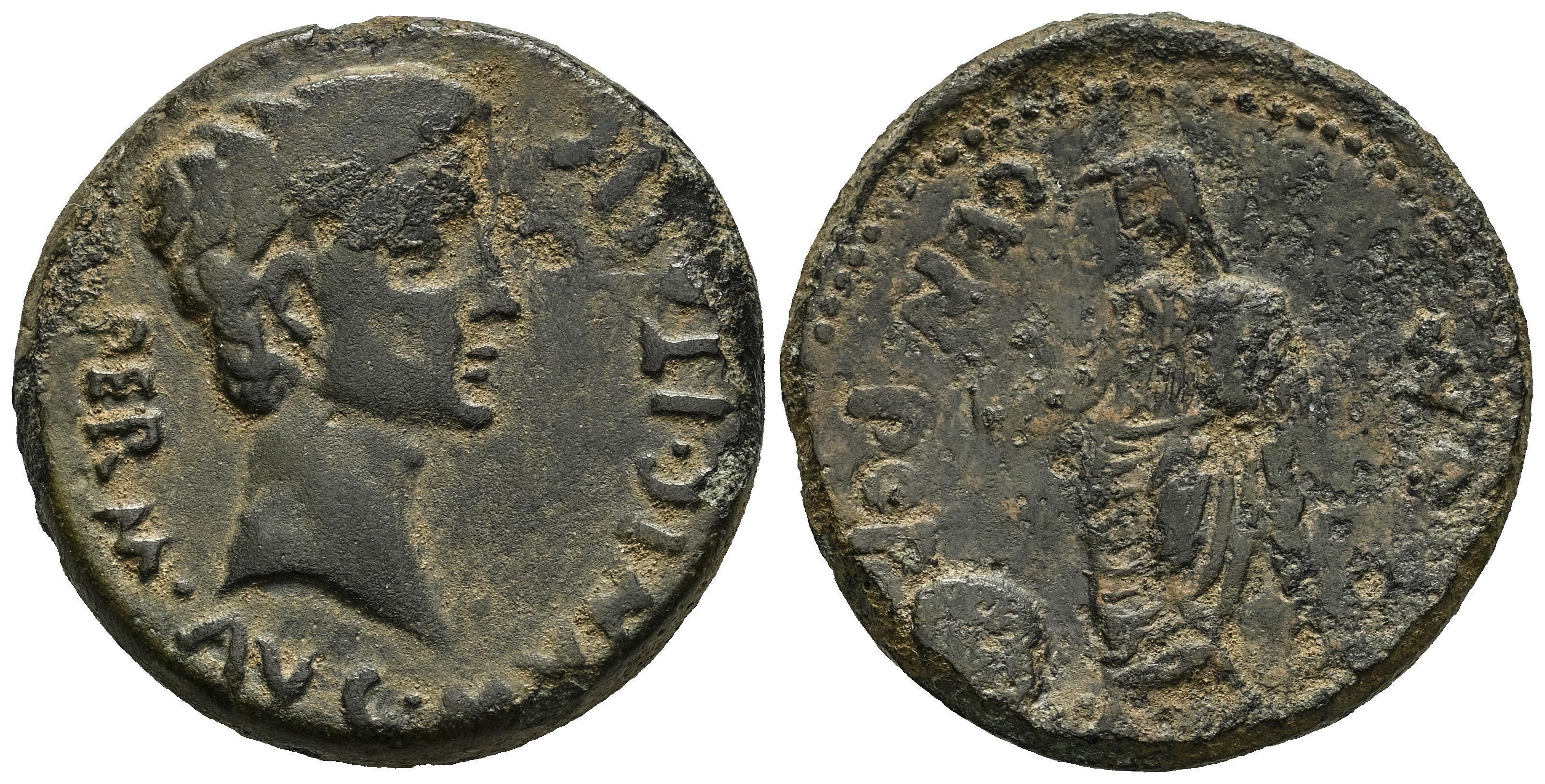 Italica. Augustus period. Unit. 27 BC - 14 AD. Santiponce (Sevilla). (Abh-1585). (Acip-3328). Anv.: PERM. AVG. MVNIC. ITALIC. Head of Augustus right. Rev.: Genius of the Roman people, globe at its feet, GEN. POP. (R)OM around. Ae. 12,00 g. Scarce. Minor rust. Choice VF/Almost VF. Est...120,00.