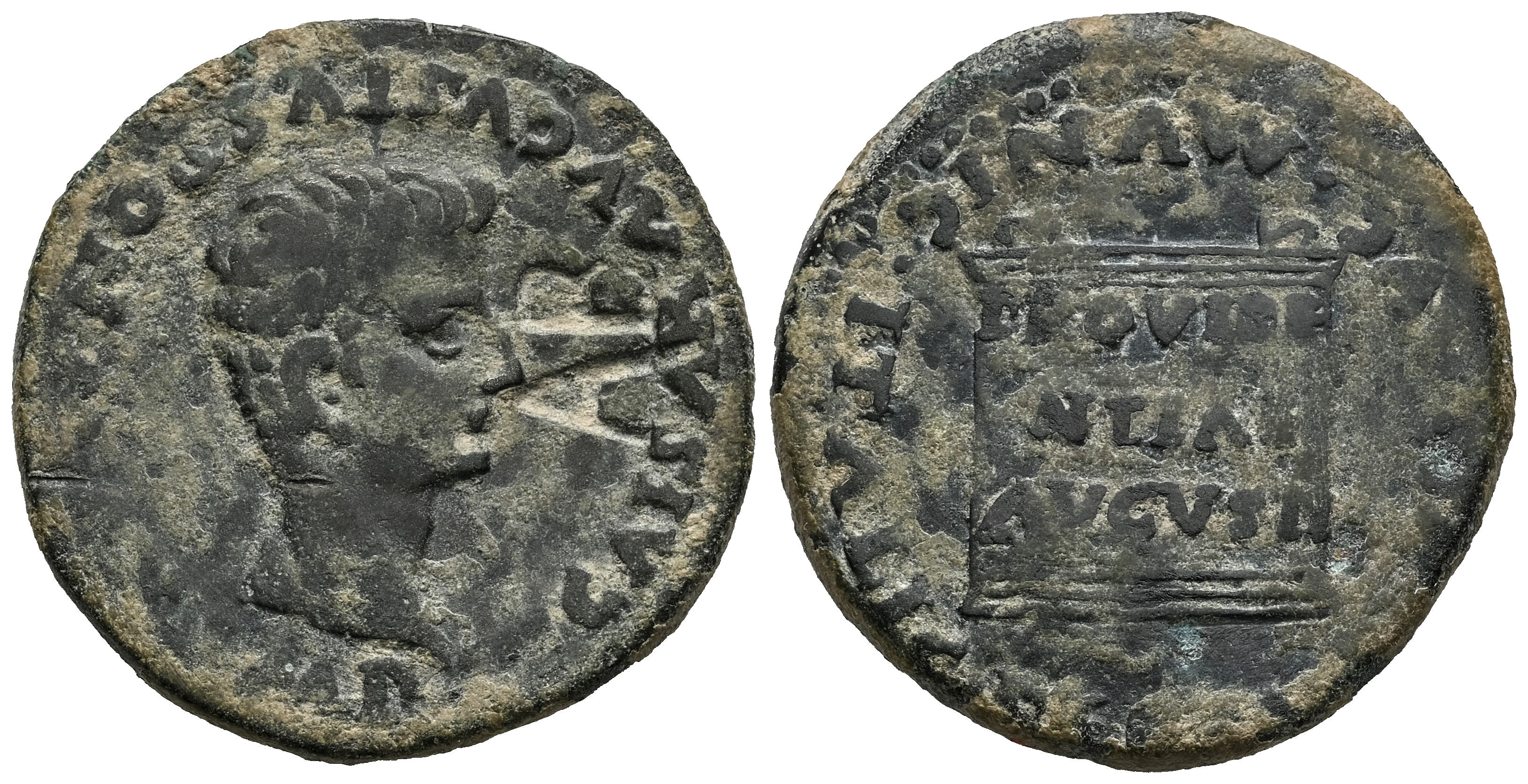 Italica. Time of Tiberius. Unit. 14 - 36 AD. Santiponce (Sevilla). (Abh-1593). (MIB-Unlisted). (Tesorillo-Type 4/13). Anv.: IMP. TI. CAESAR. AVGVSTVS. PON. MAX. Bare head of Tiberius right. Rev.: Altar with legend PROVIDENTIAE. AVGVSTI; PERM. DIVI. AVG. MVNIC. ITALIC around. Ae. 10,28 g. Countermark "AB" incised on the obverse. We have found no references to this countermark, at this or any other mints. Very rare. Almost VF. Est...120,00.