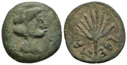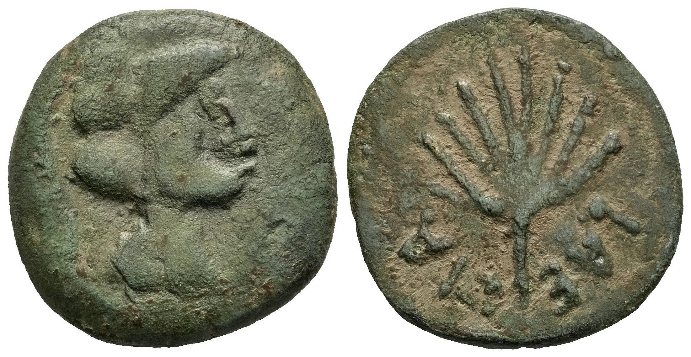 Laelia. Half unit. 50-20 BC. Olivares (Sevilla). (Abh-1651 var.). (MIB-188/4). (Acip-2363). Anv.: Helmeted head right. Rev.: Palm, inverted legend LAELIA. Ae. 5,78 g. Scarce. Almost VF/VF. Est...70,00.