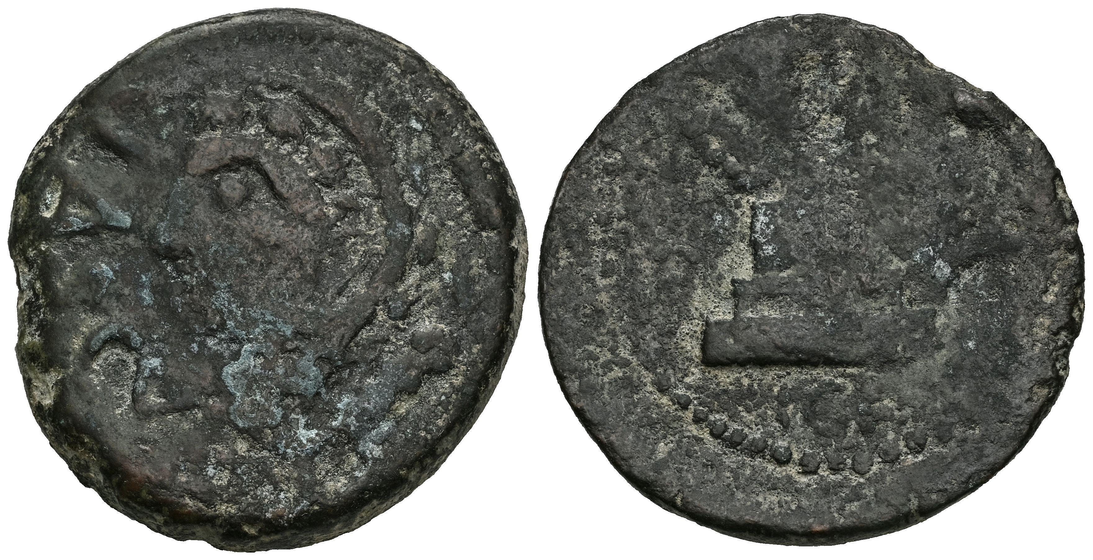 Lascuta. Unit. 150-50 BC. Alcalá de los Gazules (Cádiz). (Abh-1665). (MIB-18/01). (Acip-940). Anv.: Head of Melkart left, LASCVT before. Rev.: Altar with three palms, Libyan-Phoenician legend below. Ae. 17,42 g. Of the highest rarity. A few specimens known. Choice F/F. Est...300,00.