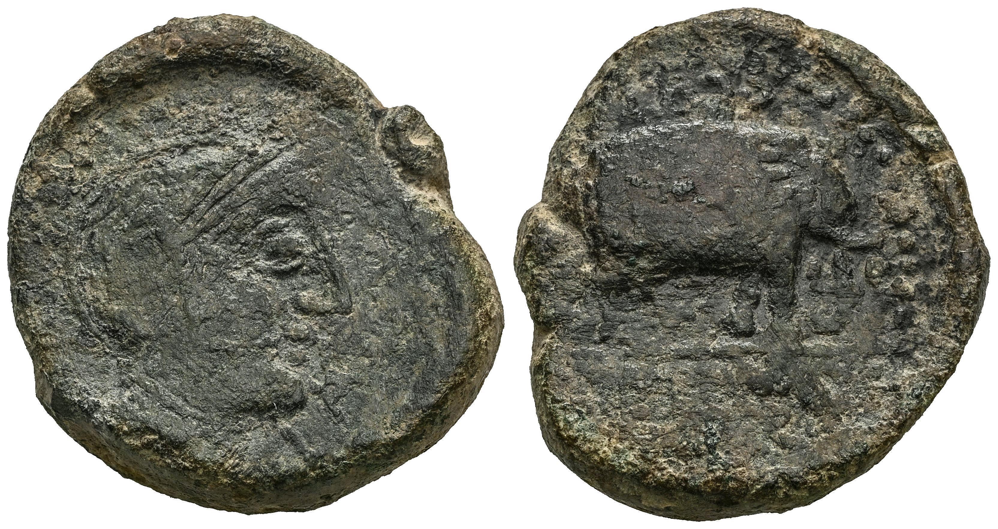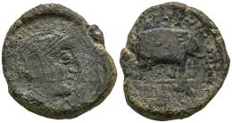 Lascuta. Unit. 150-50 BC. Alcalá de los Gazules (Cádiz). (Abh-1666). (MIB-18/05). (Acip-944). Anv.: Helmeted male head right. Rev.: Elephant right, legend M(...) SCVIC around. Ae. 23,00 g. Extremely rare. Choice F. Est...300,00.