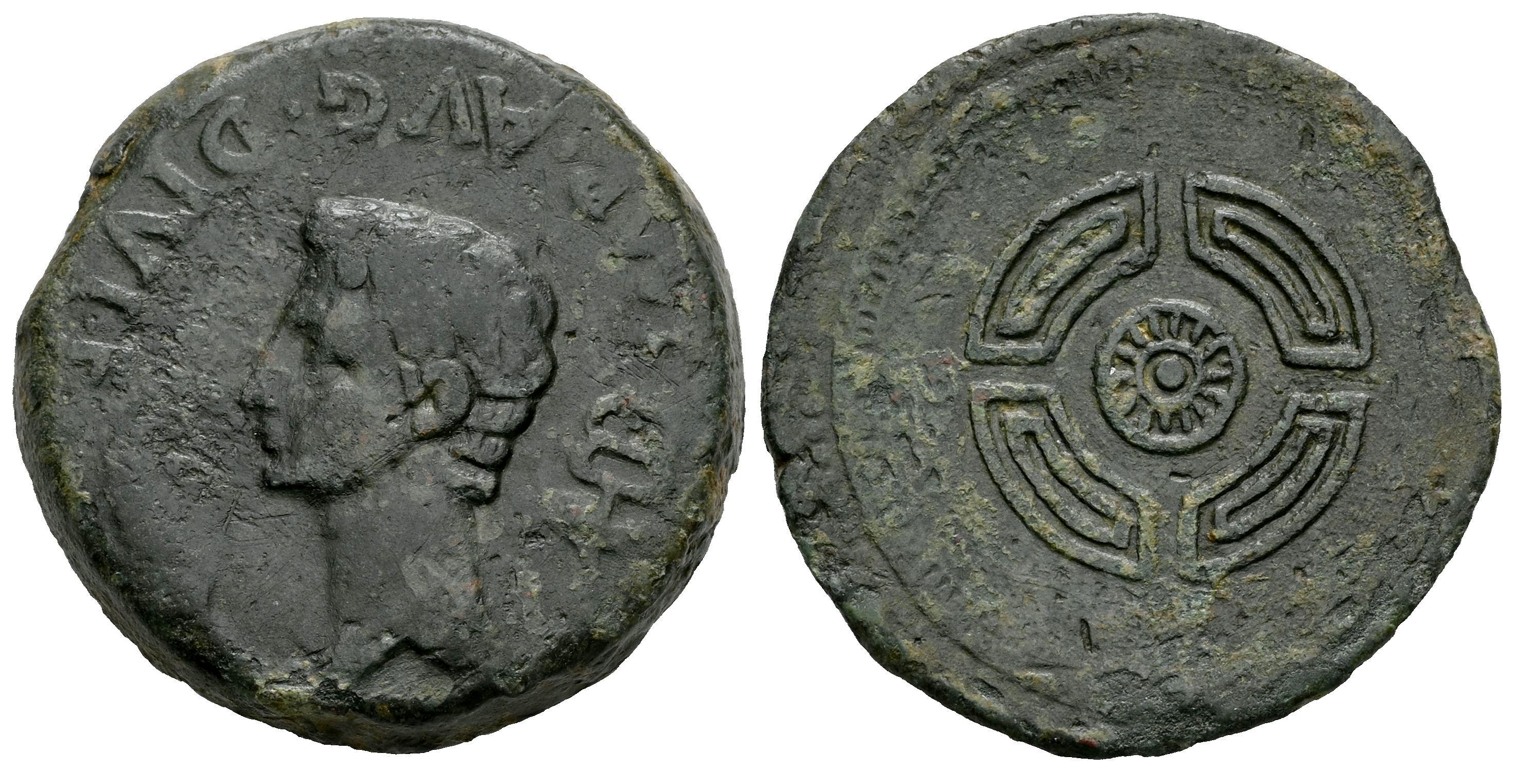 Luco Augusti. Augustus period. Unit. 27BC - 14 AD. Lugo. (Abh-1706). (Acip-3301). (C). Anv.: IMP. AVG. DIVI. F around bare head of Augustus left (smaller module), caduceus behind, palm before . Rev.: Round shied. Ae. 12,01 g. VF/Choice VF. Est...250,00.