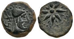 Malaka. Sextans. 200-20 BC. Malaga. (Abh-1744). (MIB-10/32). (Acip-798). Anv.: Head of Vulcan right, punic legend behind. Rev.: Eight-rayed star with intercalations. Ae. 2,37 g. Almost XF/Choice VF. Est...70,00.