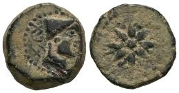 Malaka. Sextans. 200-20 BC. Malaga. (Abh-1744). (MIB-10/32). (Acip-798). Anv.: Head of Vulcan right, punic legend behind. Rev.: Eight-rayed star with intercalations. Ae. 3,10 g. Choice VF/Almost VF. Est...50,00.